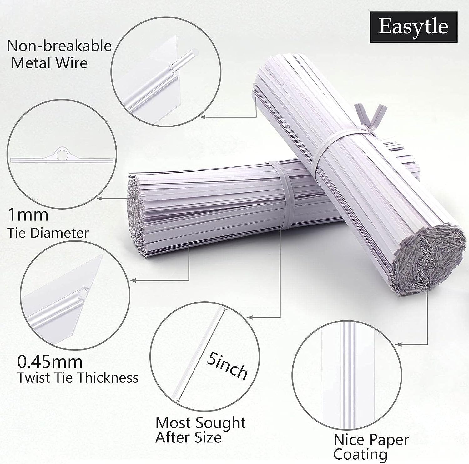 Are you looking for solution to messed-up stuff and holding items sealing plastic bags together for home, office, gardening, travel and much more? If you want to organizing your messed-up stuff or holding items together, we will have a perfect solution for you, these twist ties will meet and exceed your expectations! SPECIFICATIONS: Paper white twist ties 5" long, 0.16" wide, 2400 pieces. WIDE APPLICATION: Paper twist ties for bread bags, baked goods, storage, packing, etc. White twist ties also for DIY, art, crafts, cords, cables and much more. Bag ties are great for party, candy, coffee, cake, treat bags. Twist ties also come in handy for organizing plant branches and garden. SAFE MATERIAL: Bread wire ties are safe, odor free and pleasant to use. White paper twist ties contain no hazardous impurities. The premium quality of twist bread ties material ensures maximum safety for our customers. Bag ties twist are an excellent choice for sealing plastic bags to preserve freshness in cooking supplies. RUGGED: Twist tie made of strong metal wire core and premium paper coating, so bread ties will not break or snap. You can use bread ties twisty-ties quickly and easily close bags and tie up cords. IDEAL CHOICE: Wire ties twist are durable for indoor and outdoor. Twist bread ties are great for organizing, sealing, holding items together, and for a wide variety of arts and crafts. Wire twist ties work equally well for organizing cords under your desk for a neat, easier to clean area.