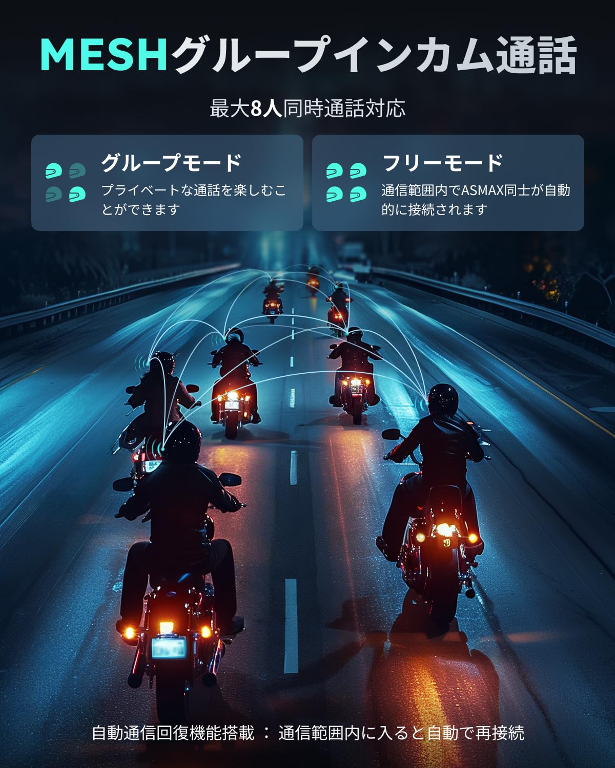 Mesh Intercom for 8 Riders: Experience seamless communication with ASMAX S1's advanced mesh technology. It links up to 8 riders within a 5-mile range, delivering ultra-stable performance. Effortlessly switch between Free Mode for open intercom within Bluetooth range and Group Mode for private team communication. Ideal for motorcycle touring, outdoor team adventures, ATV and snowmobile.