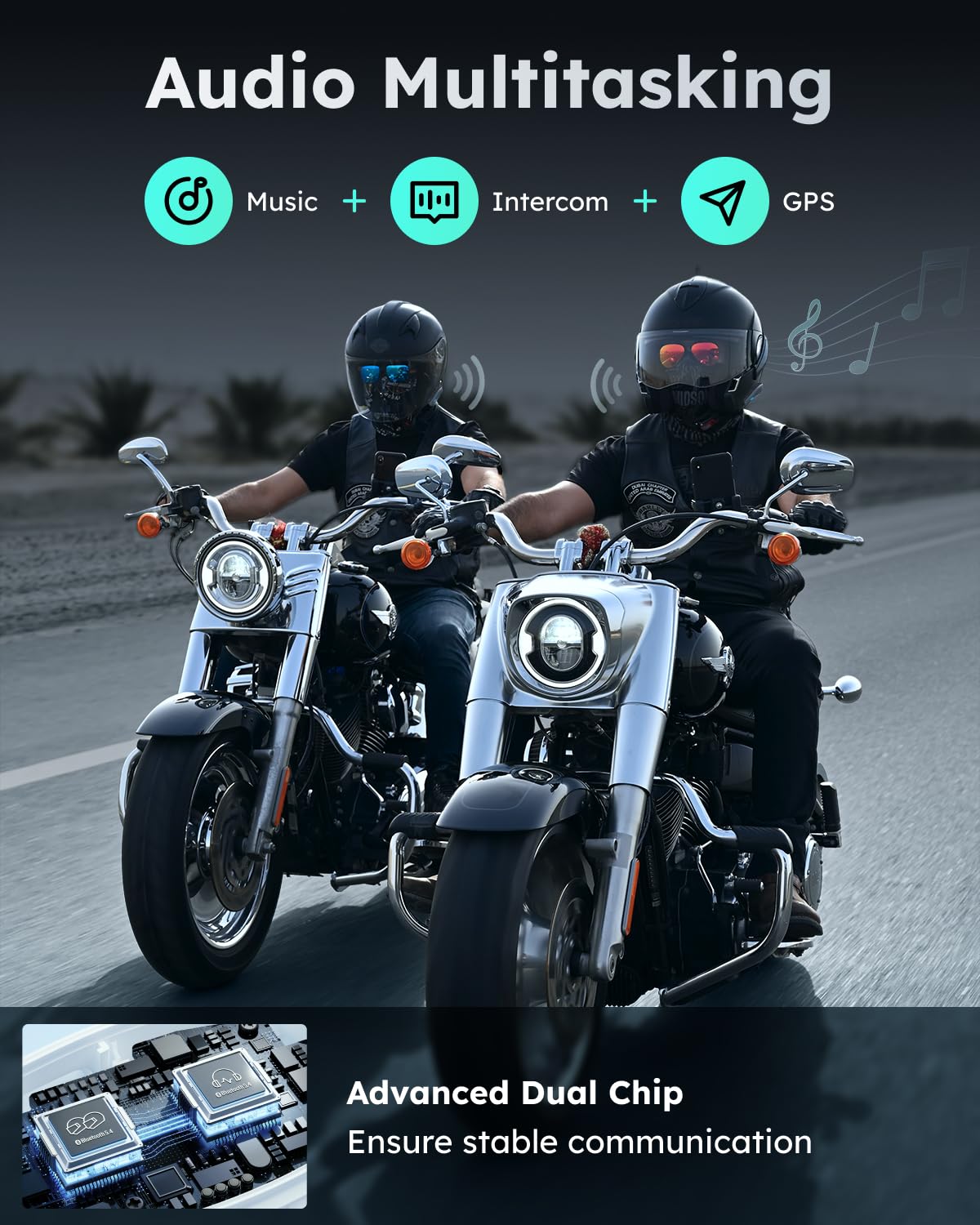 Audio Multitasking with Dual-Chip Bluetooth 5.4: The S1 motorcycle headset's dual-chip Bluetooth 5.4 handles music, GPS, and intercom simultaneously. Its octa-core processor and ENC/DSP noise reduction cancel wind and engine noise, delivering crystal-clear voice even at 120 km/h and ensuring a smooth, uninterrupted ride.