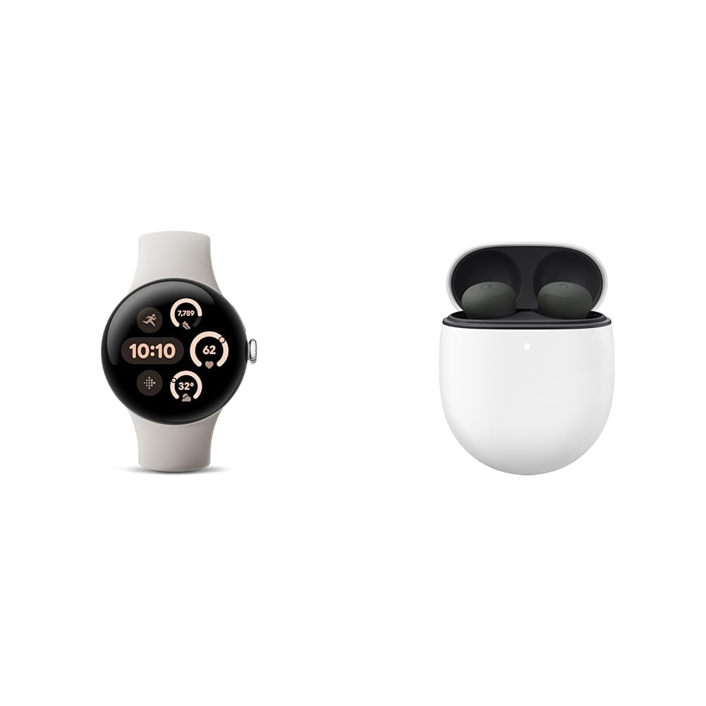 The Google Pixel Watch 3 and Pixel Buds Pro 2 bundle pairs Google's latest smartwatch and wireless earbuds to enhance your health tracking, audio experience, and connectivity. The Pixel Watch 3 smartwatch features advanced run tracking from Fitbit to help maximize performance, including custom workouts, real-time guidance, and form tracking.[3] It also provides daily readiness scores and cardio load measurements to balance training and recovery.[3] With a brighter, 10% larger display than the previous model, it makes stats easy to see.[1] Complementing the watch, the Pixel Buds Pro 2 earbuds are designed for comfort and security, staying put during workouts with their twist-to-adjust stabilizer.[2] Powered by Google's new Tensor A1 chip, they deliver immersive sound with twice the active noise cancellation as before.[1,2] The earbuds also automatically pause when you speak thanks to Conversation Detection. With robust fitness tracking from the Pixel Watch 3 and premium sound and comfort from the Pixel Buds Pro 2, this bundle is ideal for active users who want the latest and greatest from Google.