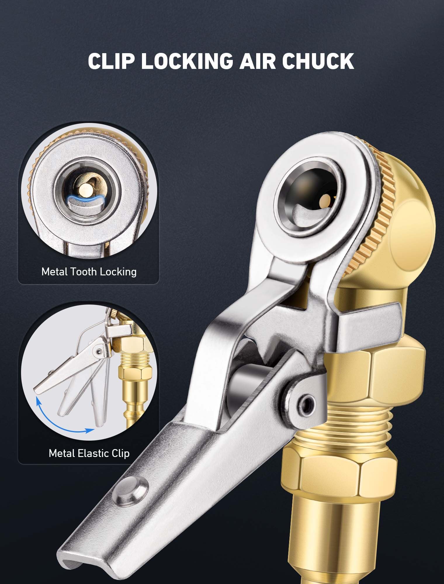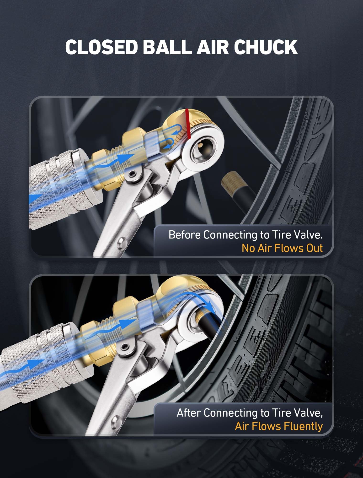 【Closed Ball Clip-on Air Chuck】: Closed ball tire chuck with clip with 1 x 360° swivel quick plug and 1 x 1/4" MNPT air chuck quick plug. Air chucks for tires design helps to easily lock the commonly Schrader Valve. To use, simply clip it onto the tyre valve to inflate, freeing up your hands!