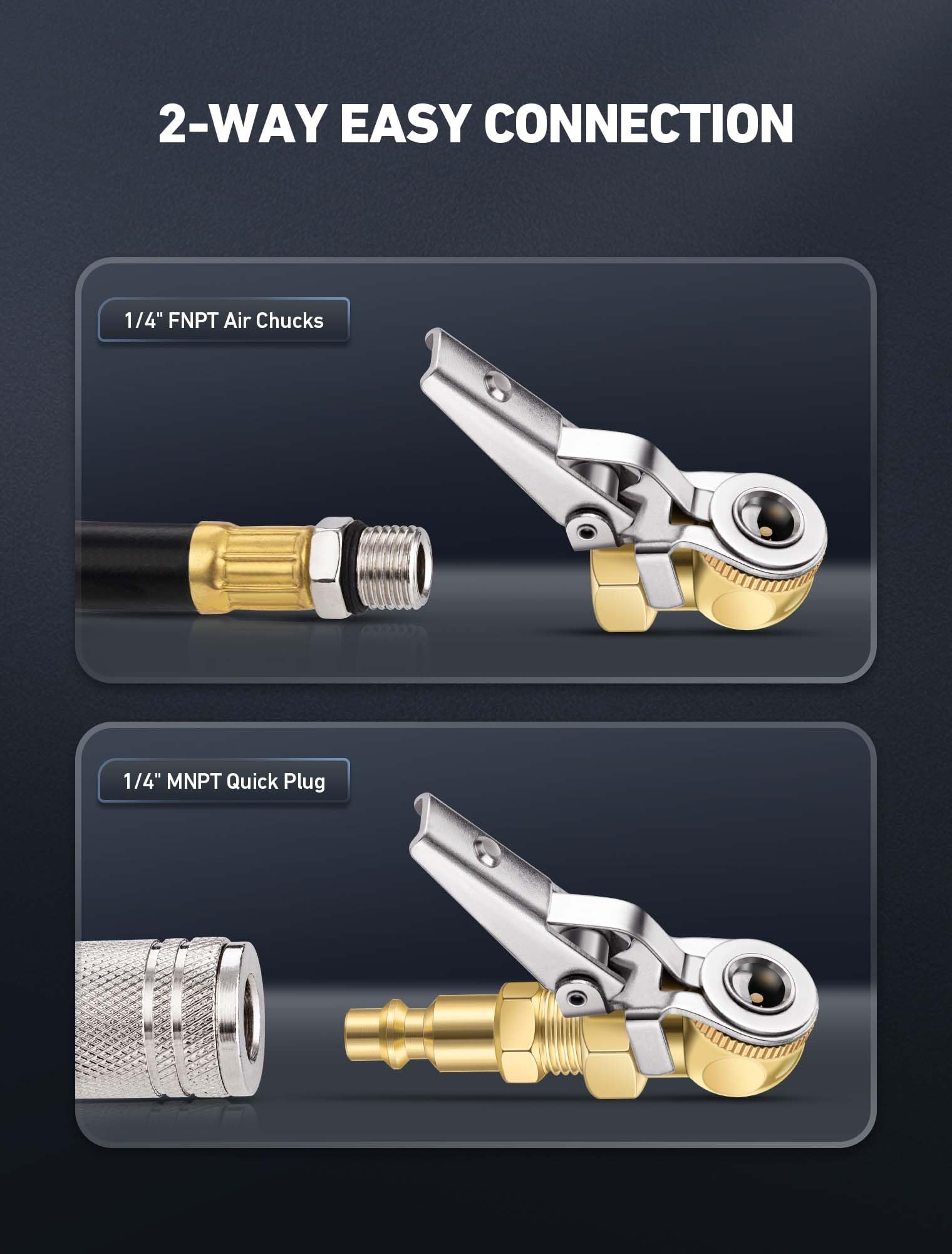 【2-Way Easy Connection】: Both air chucks featured standard US 1/4" NPT thread for easily connected to air lines, air compressor or tire inflator gauges for tire inflation. Also can be connected to air lines' female quick couple by male plug included in package. (Please use the included sealed raw tape to prevent leakage)