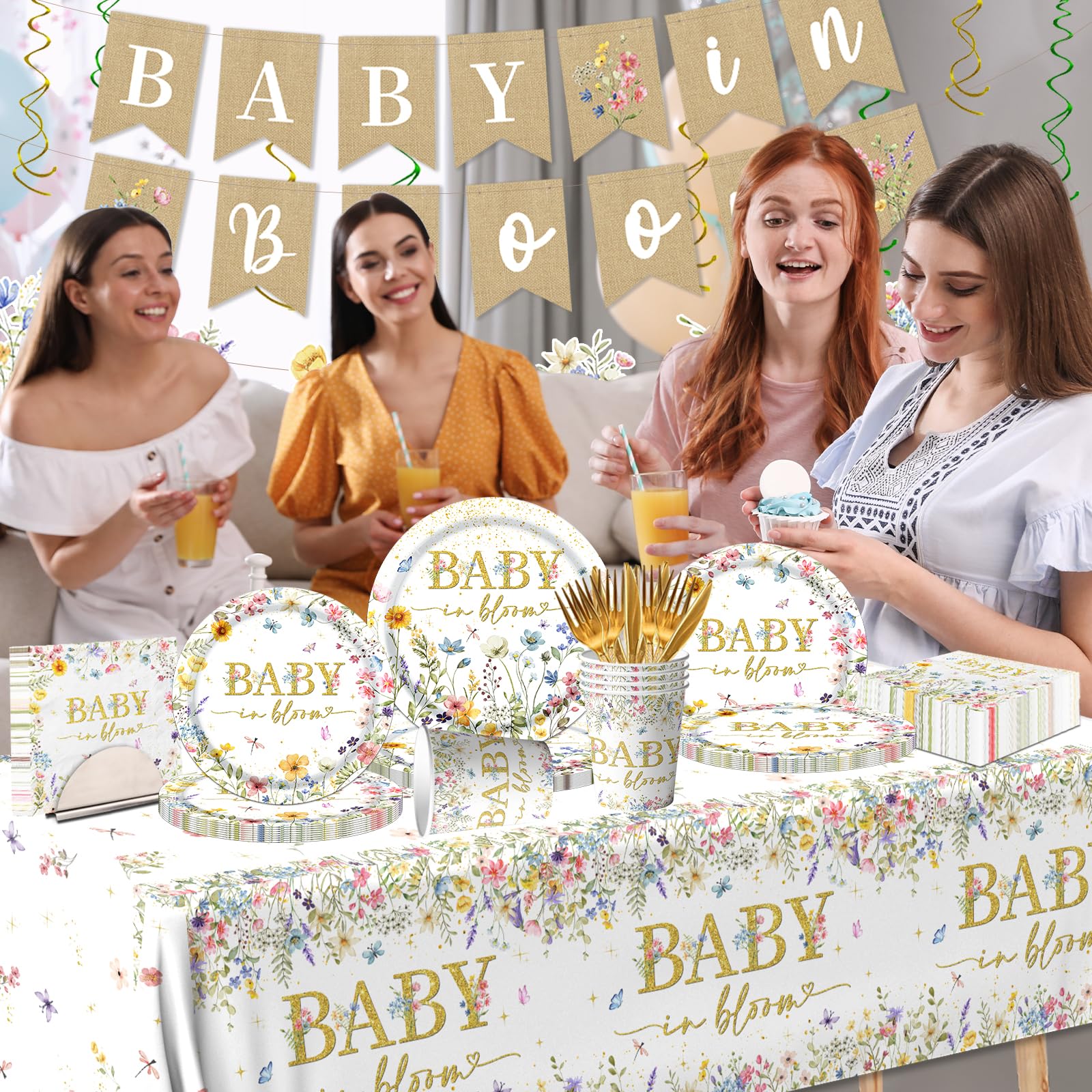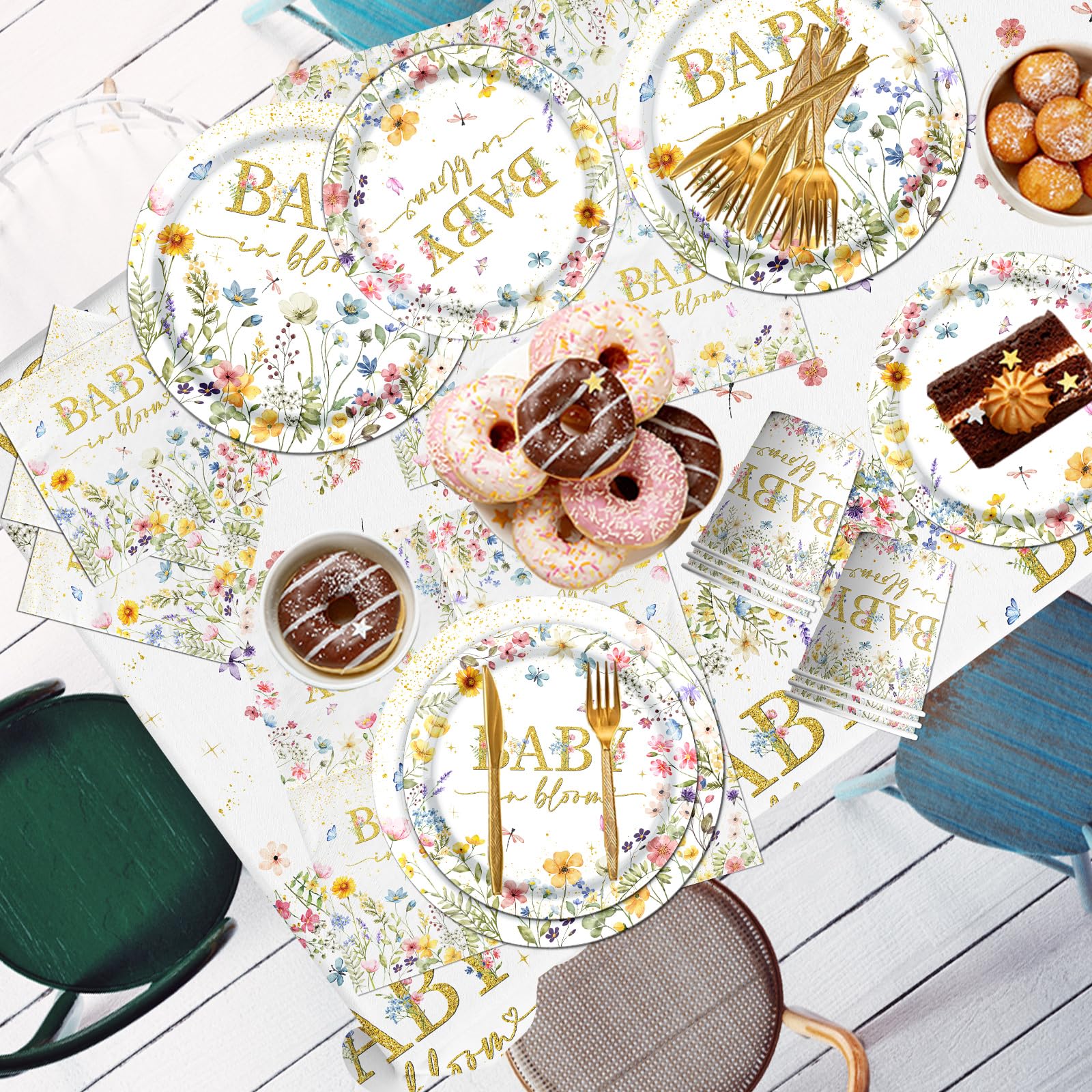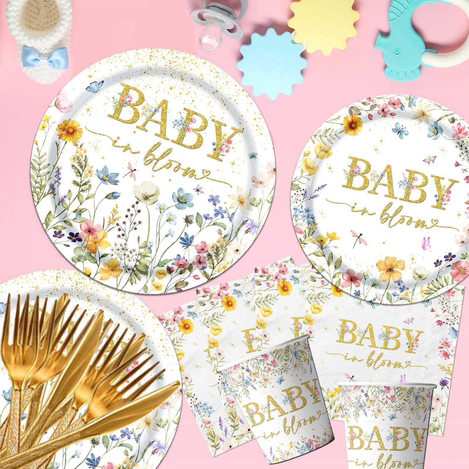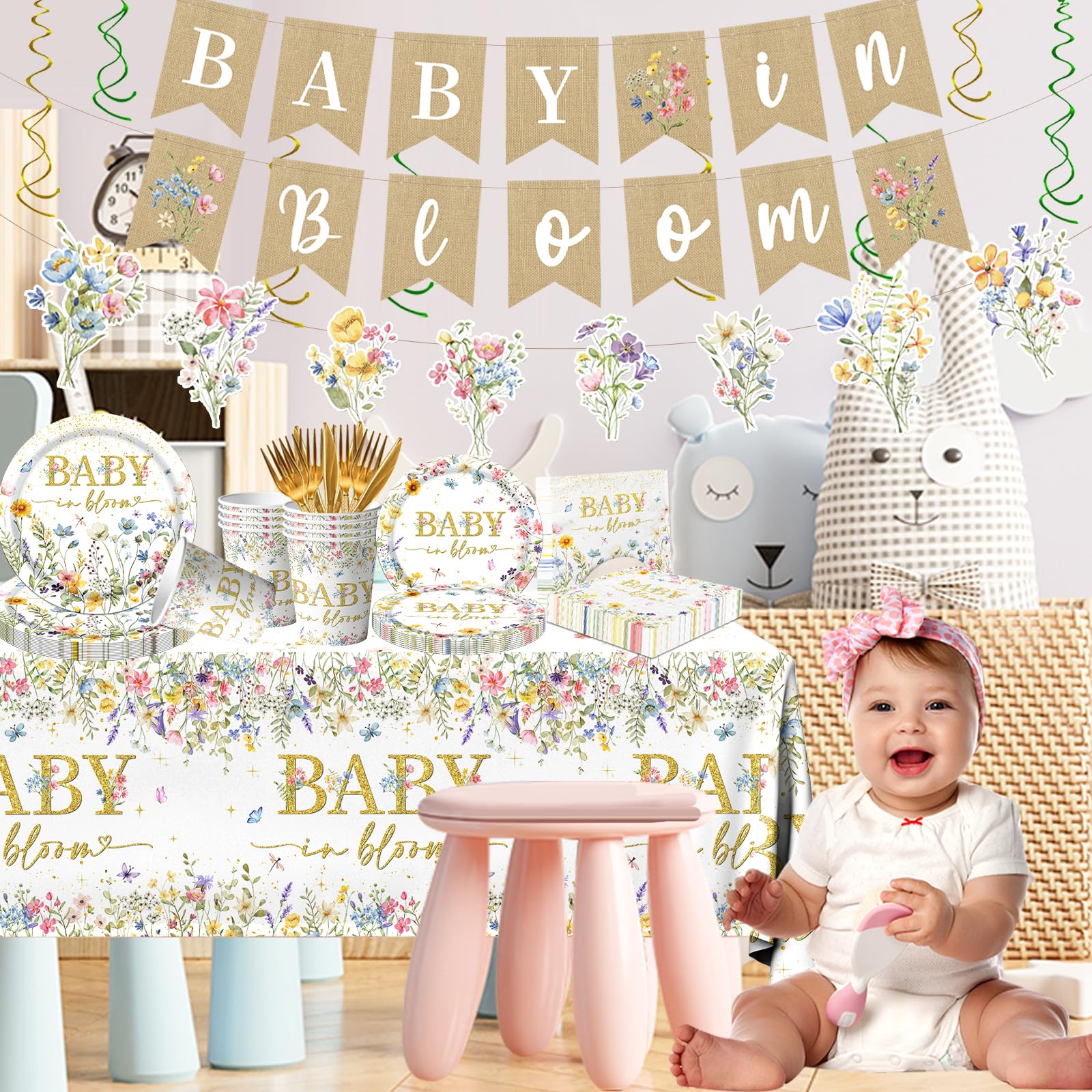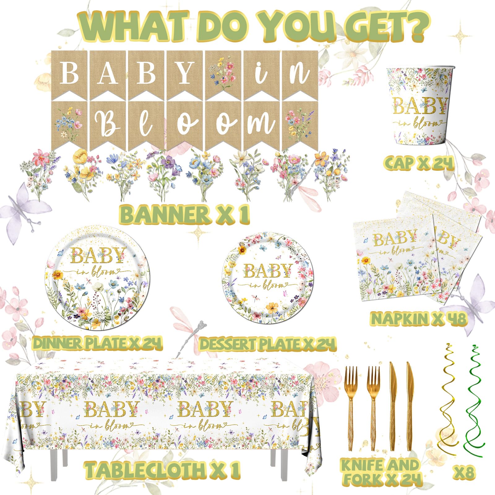 【FLOWER】Choose distinctive baby shower decorations! You will get 178pcs baby in bloom themed party supplies,1piece banner,1piece tablecloth,8pcs hanging swirls,24pcs 9"plates,24pcs 7"plates,24pcs 9oz cups,24pcs knives,24pcs forks and 48pcs napkins.