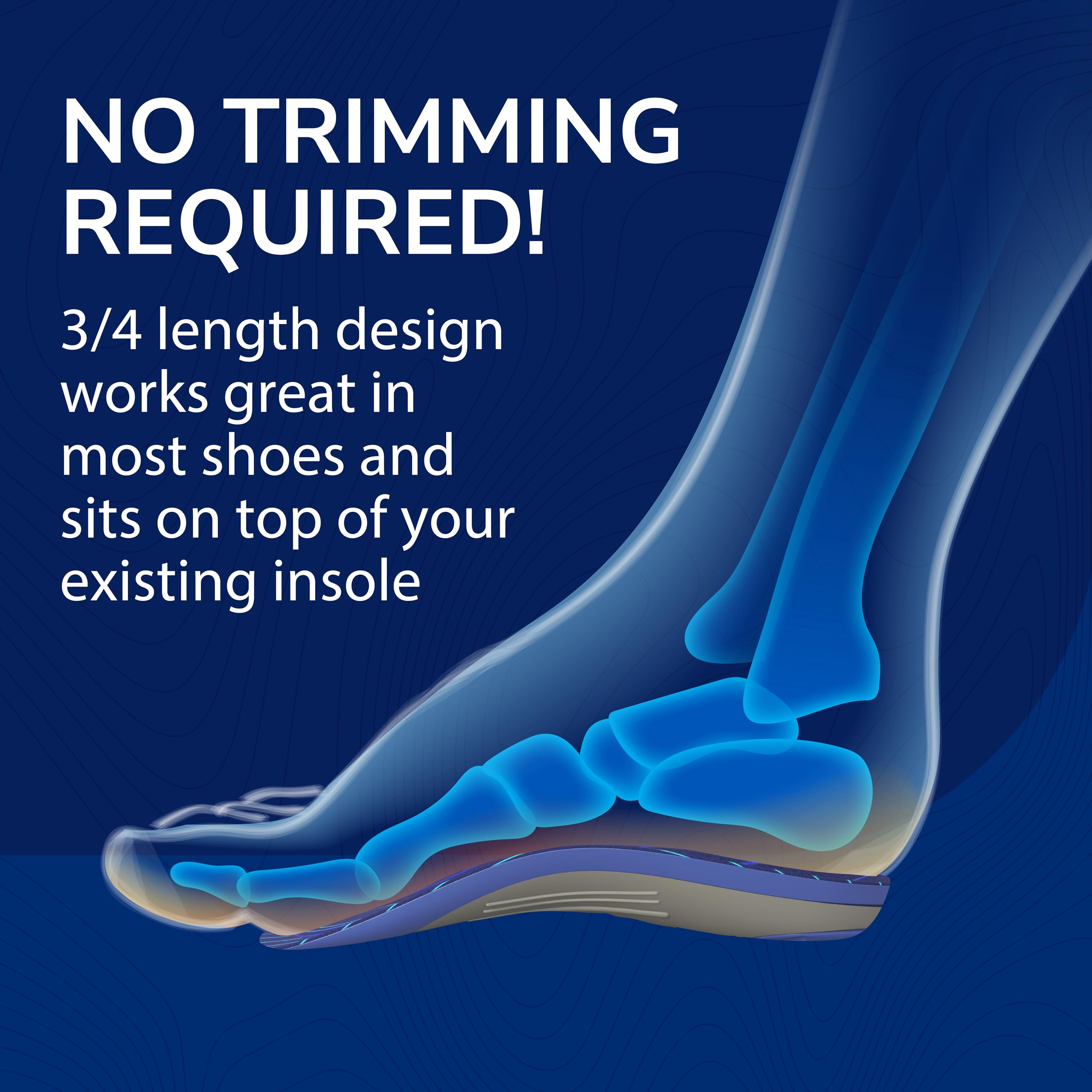 EASY TO USE SLIP-IN DESIGN: These 3/4 length orthotic inserts slip easily into most shoes without trimming and are ideal for styles where the original insole canβt be removed. Switch between shoes with ease while maintaining consistent comfort all day.
