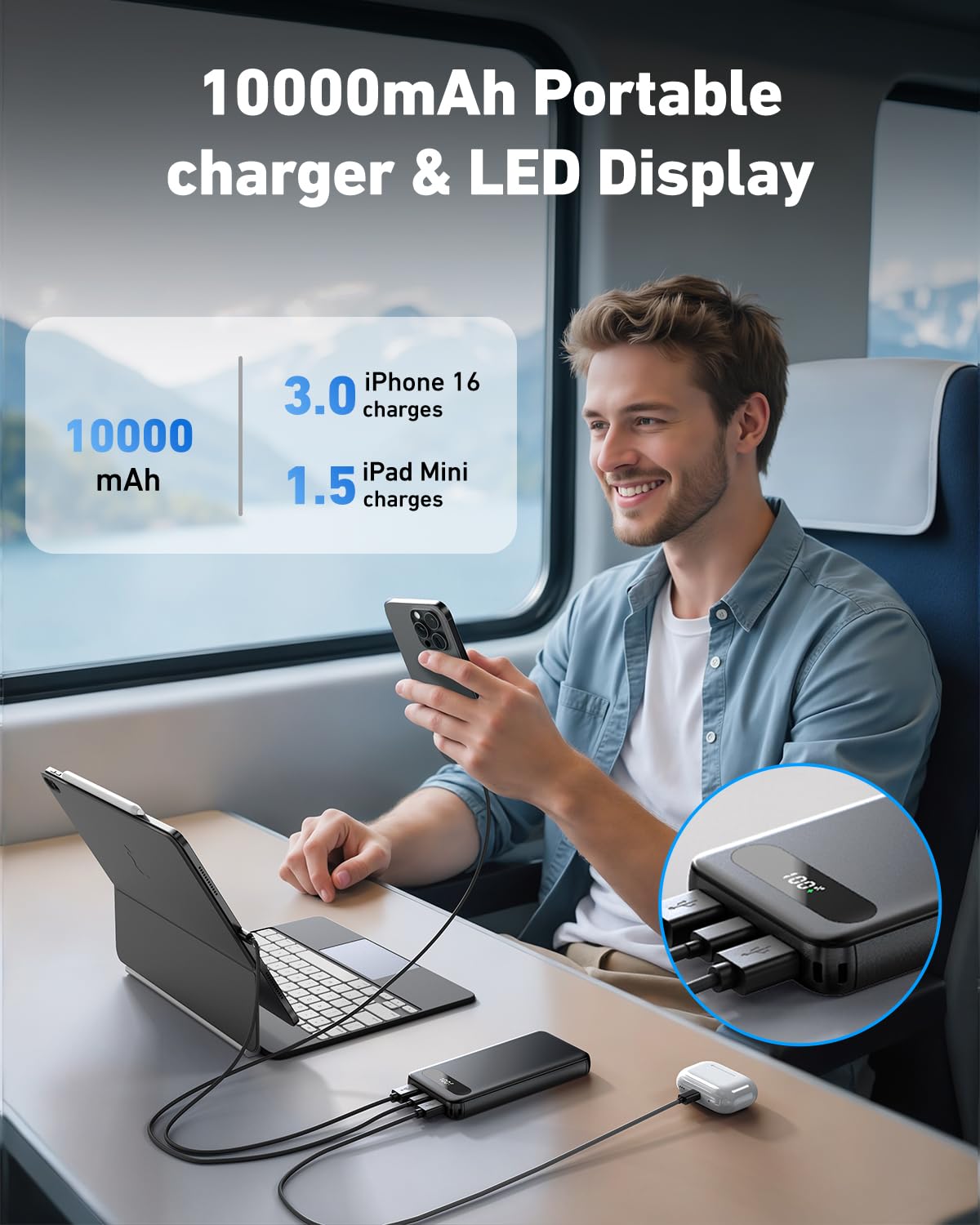 Ultra-Portable Design:Despite its 10,000mAh high capacity, it features an incredibly slim profile. It's thinner, smaller in size, and lighter than similar products, easily fitting into your backpack or pocket without any bulk.