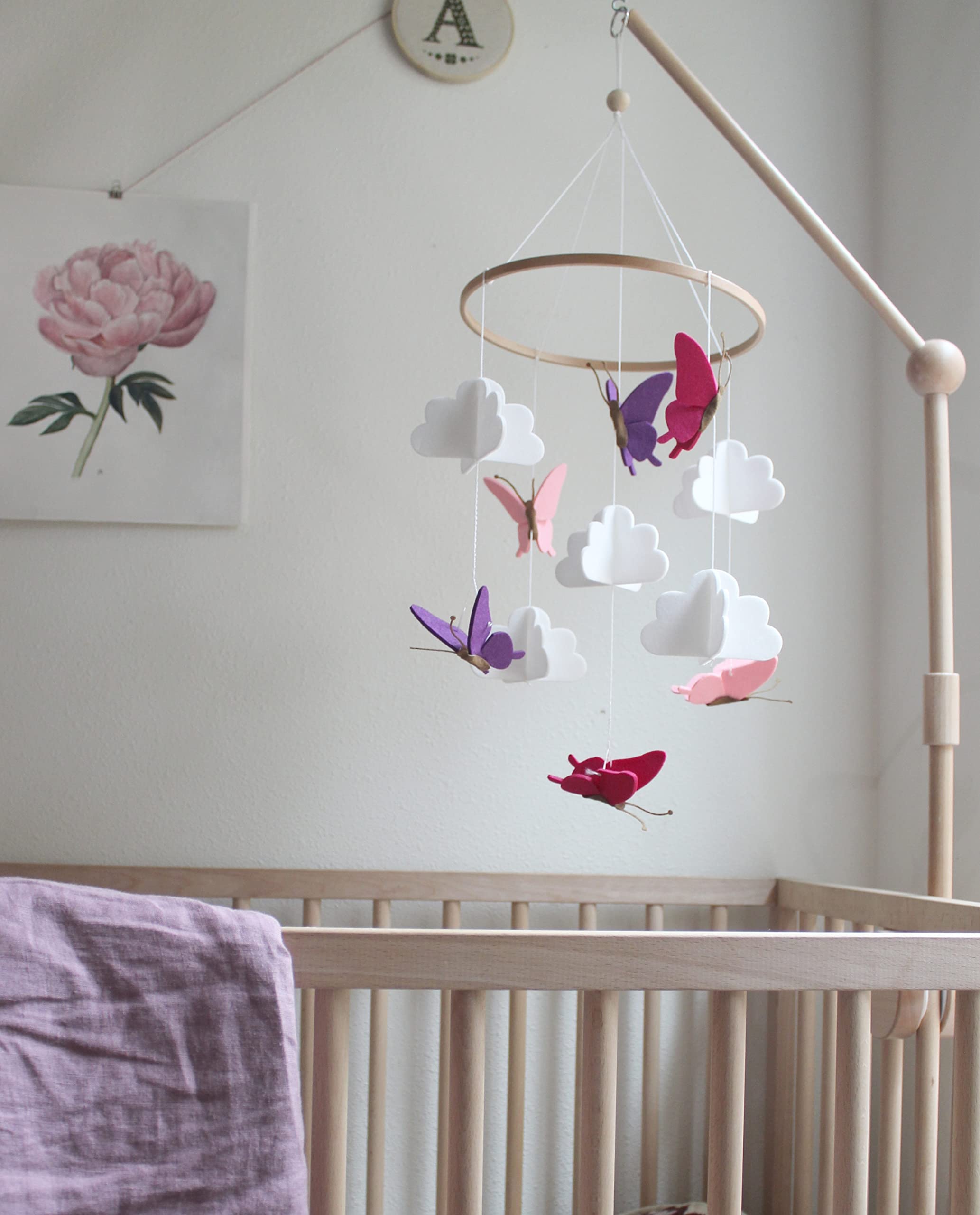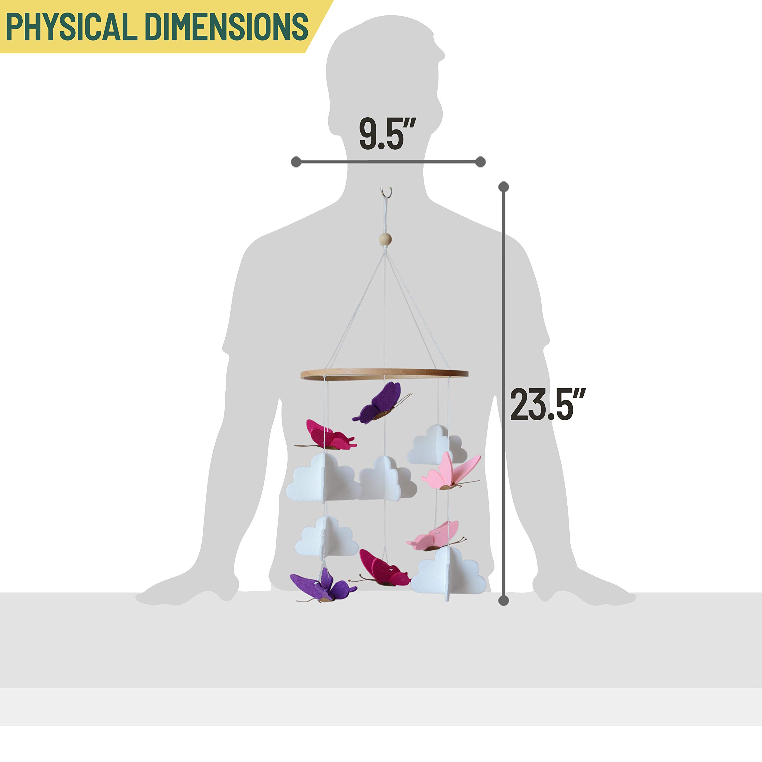 ♡ UNIQUE AND MINIMALIST DESIGN - Bring the outdoors inside with this serene butterfly-themed baby crib mobile! The pink, fuchsia, and purple butterflies with clouds create a dreamy butterfly garden, floating overhead to help your little one to sleep.