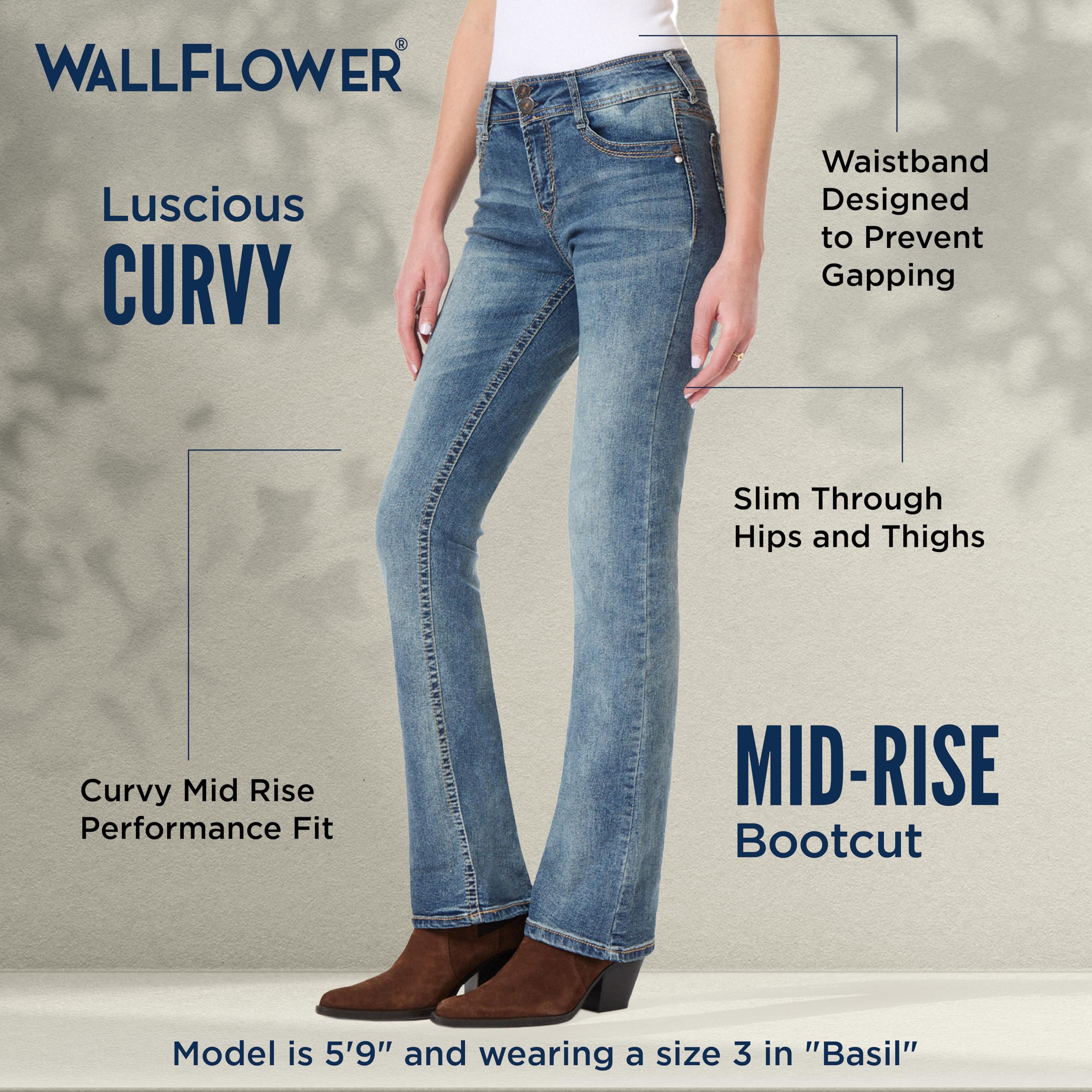 Description WallFlower boot cut jeans for woman mid rise curvy jeans for women in Insta Stretch denim jeans for women bootcut is our stretchiest ever, with outstanding recovery that keeps your jeans for women looking amazing all day. With the premium feel and endless holding power of these boot cut jeans women you’ve definitely found your new favorite womans jeans. Maintain your cool and casual style whether you're on horseback or heading back to school. Style our jeans for women bootcut in 90s, jeans for women trendy y2k aesthetic, festival and everyday stretchy boot cut jeans for women looks. The versatility also makes these great travel pants women. Find petite women's bootcut jeans, straight size women jeans, mid size womens mid rise jeans and plus size womens bootcut jeans, in 3 different inseam lengths. Made for Every Body. Period. WallFlower makes women jeans bootcut that feature a contoured waist in mid rise boot cut jeans for woman so you get a flattering, gap-free fit. These are jeans designed with roomier hips and thighs for ultimate comfort. Plus, butt lifting jeans for women for that extra oomph and 5-pocket styling adds a touch of classic boot cut jeans for women style.