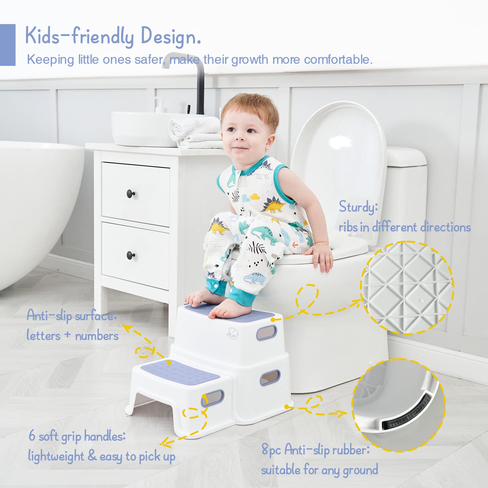 【Safety & Maneuver】The toddler step stool for bathroom sink includes 8 slip resistant soft rubber feet for extra security and don't slide on tile floors. The carrying handles of step stool are comfortable for toddlers' hands. It's lightweight for toddlers to pick up and move anywhere around the house.