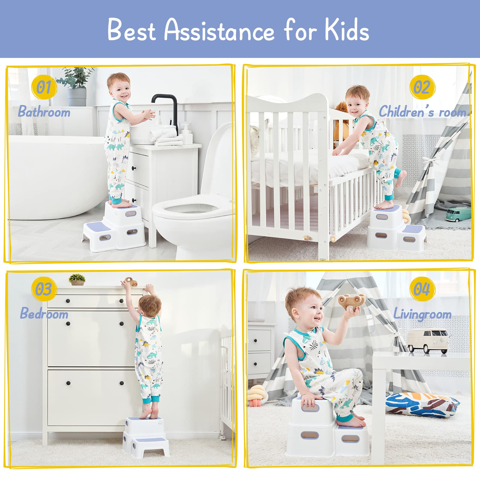 【Best Assistance for Toddlers】Two step stool for toddlers provides the best assistance for your growing toddlers. They can use it from potty training on the toilet to reaching bathroom sink brush teeth or wash hands, play piano as hold kids’ feet, sit to read books in nursery, and just about anywhere else that needs a little boost to reach.