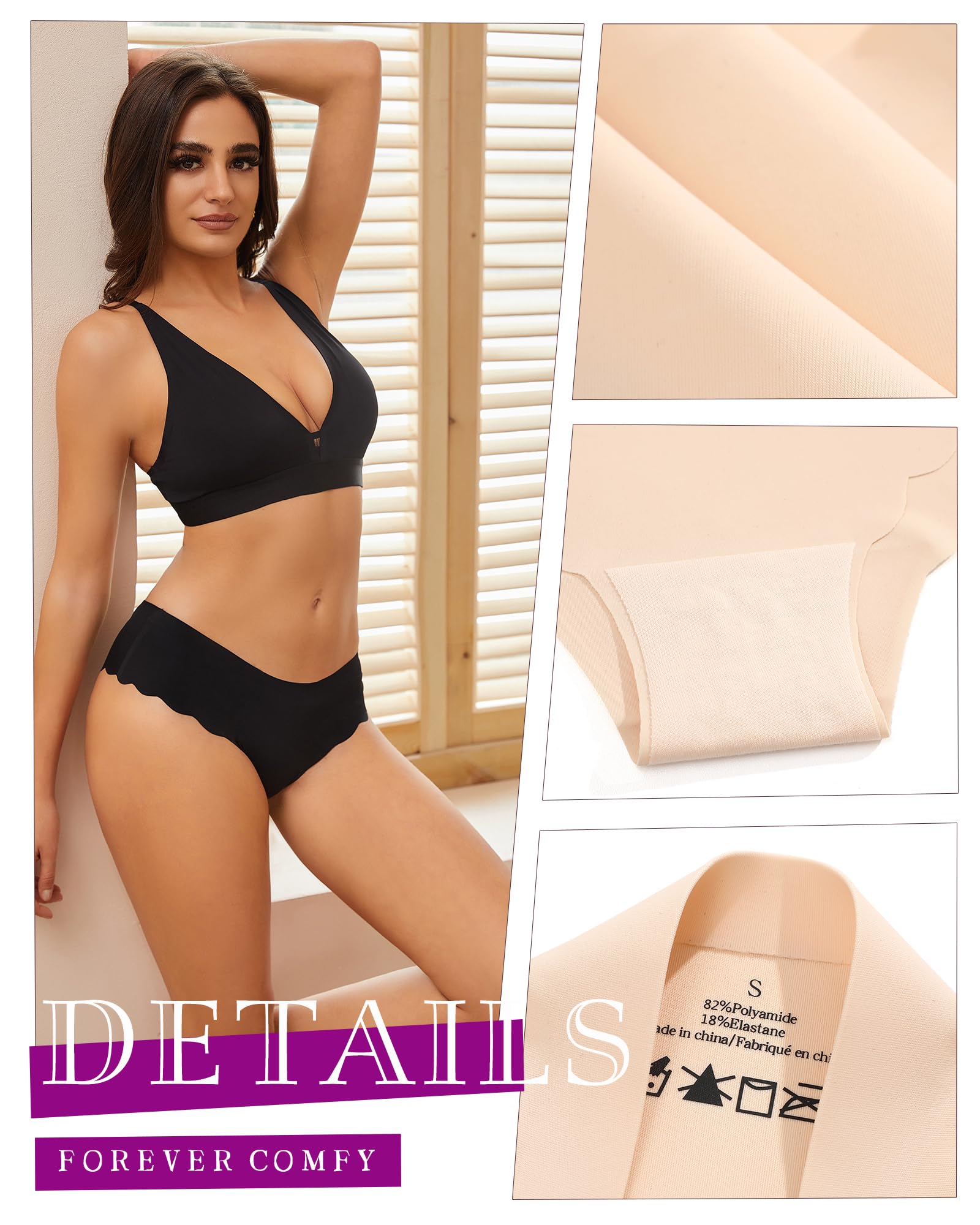 SEAMLESS UNDERWEAR FOR WOMEN: 82% Polyamide 18% Elastance. It is silky and smooth, won't irritate the skin and won't deformed by washing. 100% nature cotton layer to the crotch offers more protection and healthy. Laser cut, low rise bikini for a smooth look under clothes.