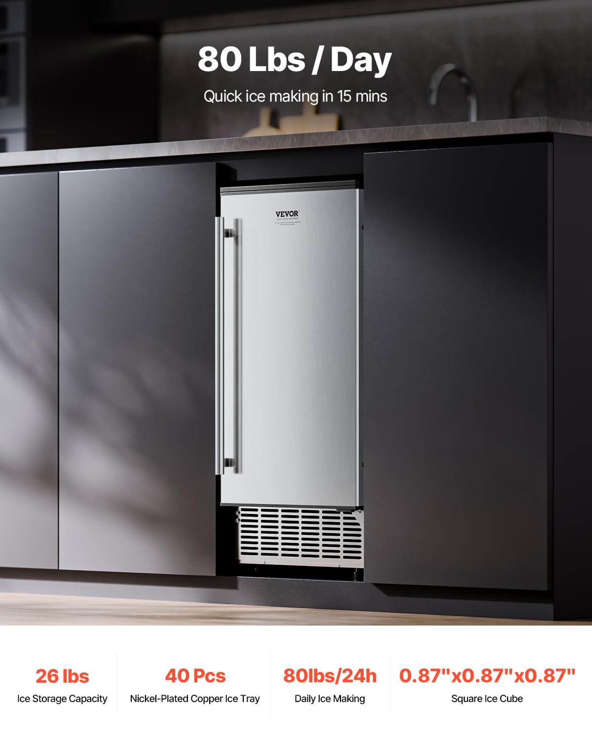 Fast Ice Making & Large Ice Storage: Our undercounter built-in ice maker can produce up to 80 lbs of ice within 24 hours and store up to 26 lbs. It features a 40-cube nickel-plated copper ice tray, making square ice cubes (0.87x0.87x0.87 inch) in as fast as 15 minutes. Ideal for home use or parties.