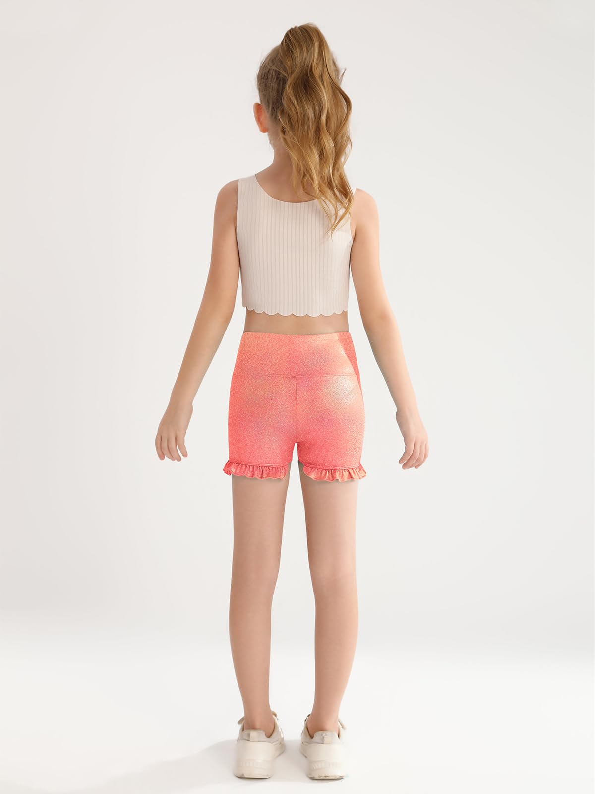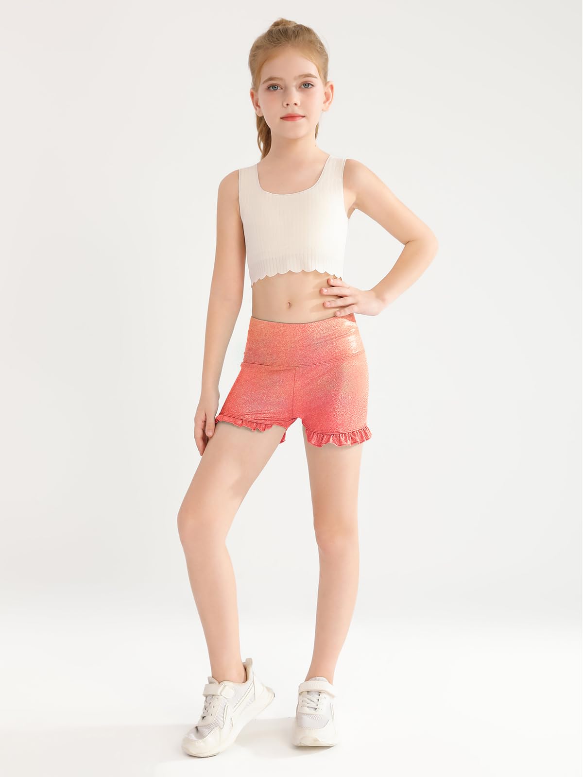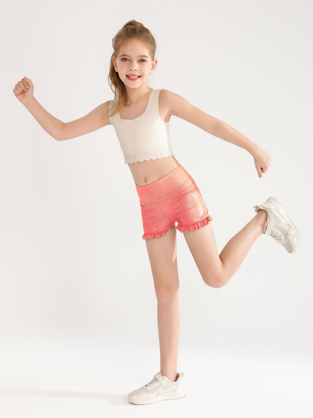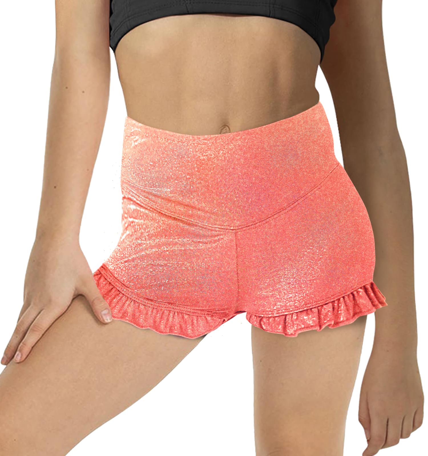 Features: Girls booty dance shorts, ruffle hem, high wasit, wide waistband contours body curves and streamlines shape help to promote yoga shorts compression and support