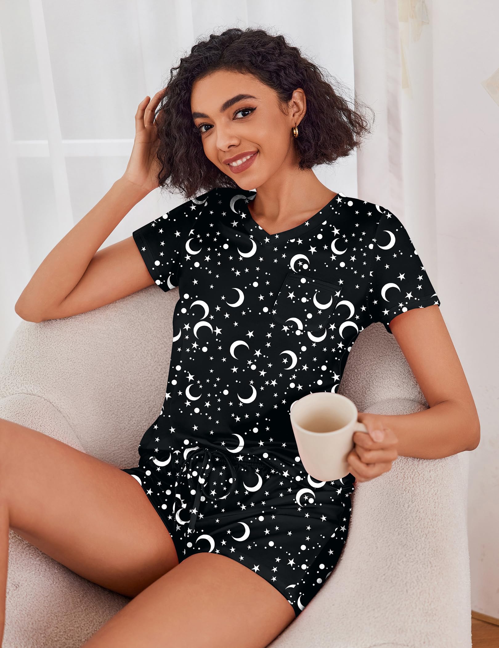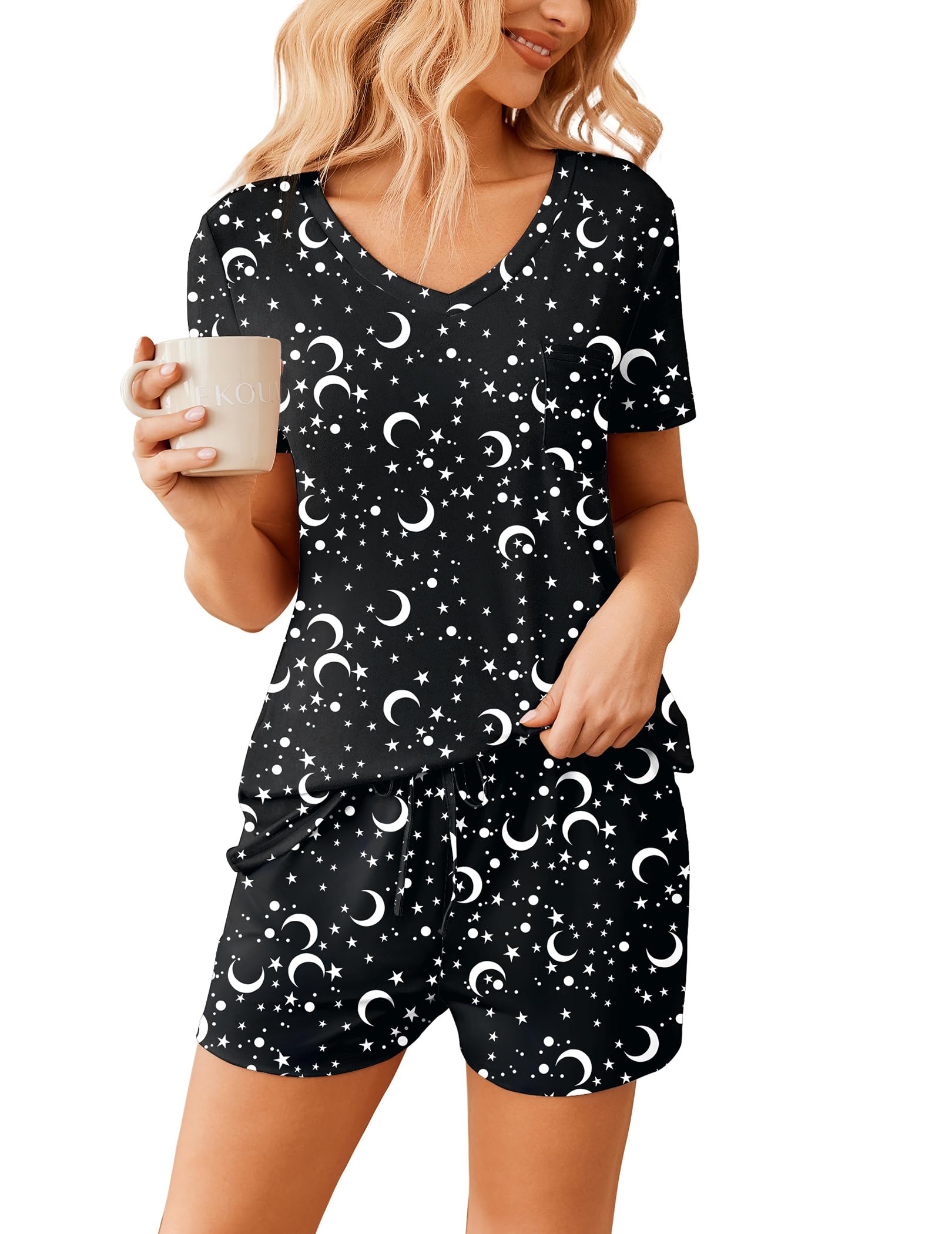 FEATURES: pajama sets for women 2 piece, pj sets for woman, V neck women's pajama sets, short sleeve T-shirt, drawstring elastic waist shorts.