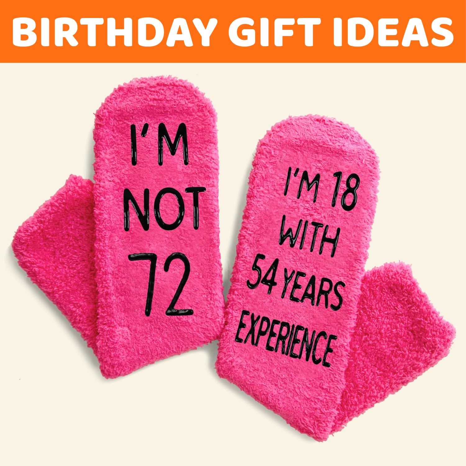 GIFTS FOR WOMEN IN THEIR 72S: Say it with socks - "I'M NOT 72, I'M 18 WITH 54 YEARS EXPERIENCE." These are suitable for any holiday gifts, such as Birthday gifts, White Elephant gifts, Christmas gifts, Mothers Day gifts.