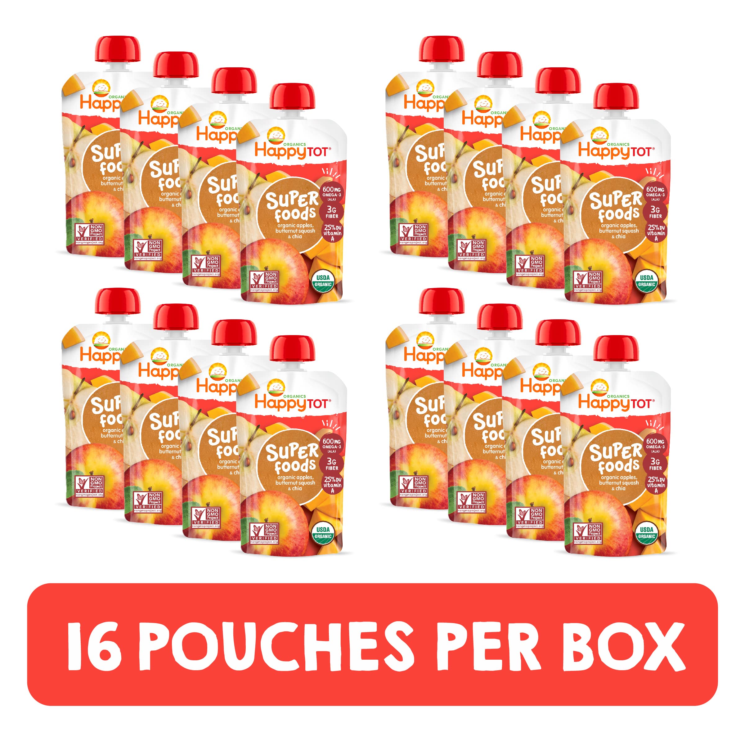 Product Description Happy Tot SuperFoods pouches help little ones get key nutrients from organic vegetables, fruits and chia, a source of Omega-3 (ALA). Made with wholesome ingredients selected to support this age and stage of totsβ development, this smooth puree is a delicious blend of tasty fruits, complimentary veggies, and nourishing chia seeds. For your picky eaters and active toddlers! Itβs convenient, nutritious snacking anytime, anywhere β grab these superfoods for your super tot! Manufacturer's Notice http://www.fda.gov/Safety/Recalls/ucm197522.htm