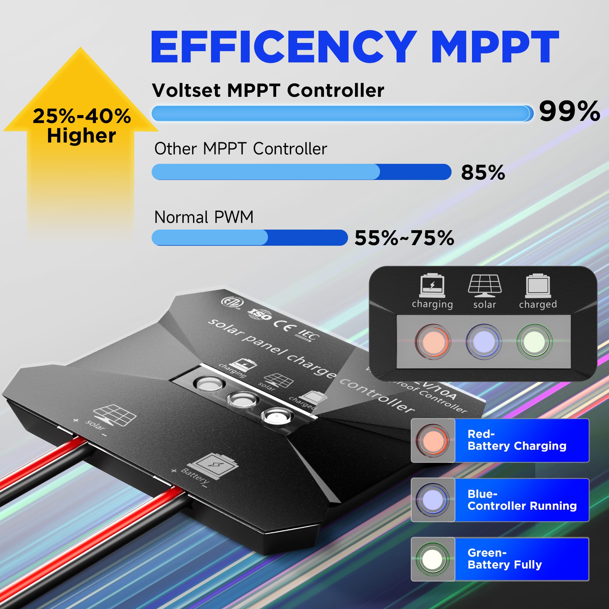 Universal 12V Battery Compatibility - Works with LiFePO4, AGM, Gel, Flooded, and Lithium Ion batteries. Ideal as RV solar battery charger, trailer solar battery charger, or marine solar battery charger. One versatile solution for all your 12V charging needs.