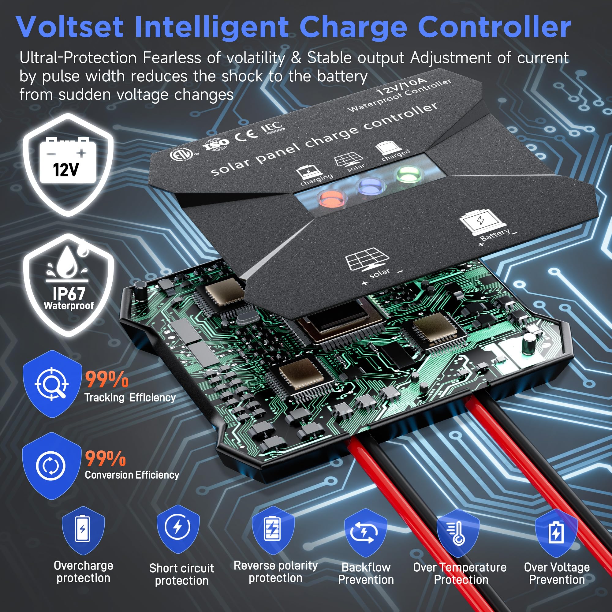 Advanced Multi-Layer Protection - Built-in safeguards prevent overcharge, over-discharge, short circuit, and reverse polarity damage. Smart controller stops draining power at night. Keeps your 12V battery healthy and extends lifespan. Worry-free operation for long-term use.