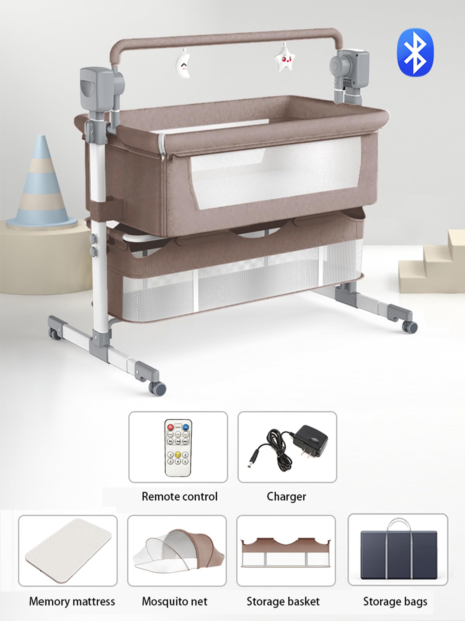 【Smart Remote Control】 The baby Crib is equipped with a smart remote control, reducing the pressure of parents to coax the baby, and freeing parents' minds and bodies. Furthermore, with smart remote control, there is no need to get up to coax the baby.