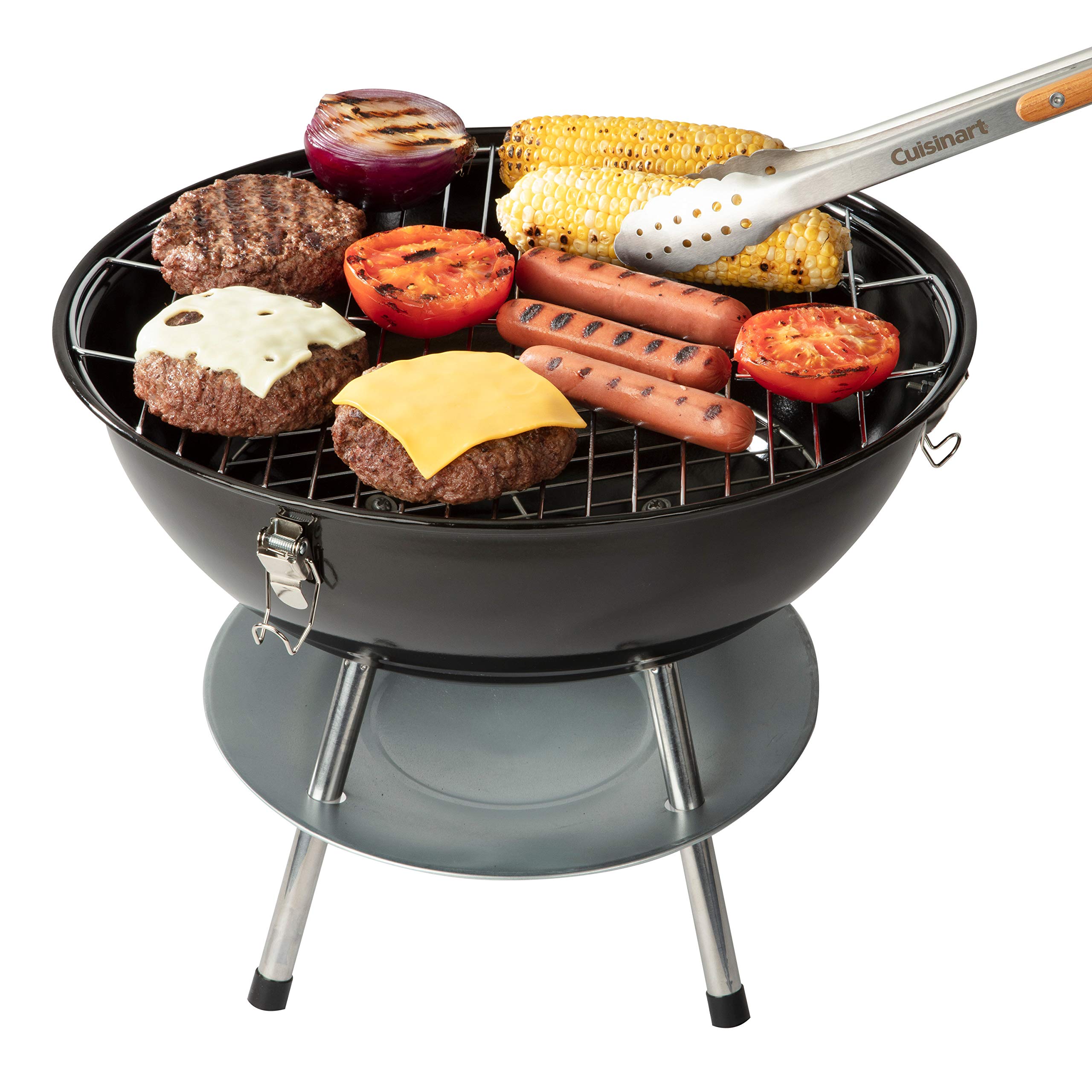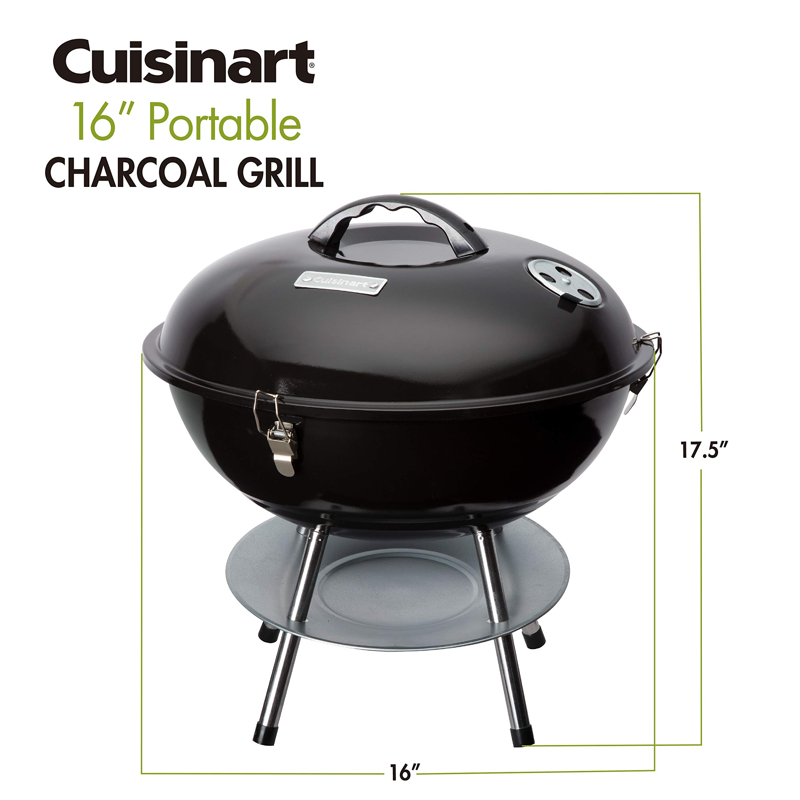 The Cuisinart 16" Portable Charcoal Grill offers the perfect solution for easy grilling when camping, tailgating, or at home! This compact grill is lightweight and easy to transport, featuring locking latches that keep the lid secured to the body. The 4-legged design is ideal for stability while grilling, ensuring your grill wont rock or tip during use. Controlling temperature is so important when cooking with charcoal, so that is why the Cuisinart 16" Portable Charcoal Grill features a dual vent system with an air inlet vent on the bottom of the fire bowl and an air exhaust vent on the lid. The ash catcher below the fire bowl protects the surface beneath your grill from any hot bits of charcoal that may fall through while cooking.