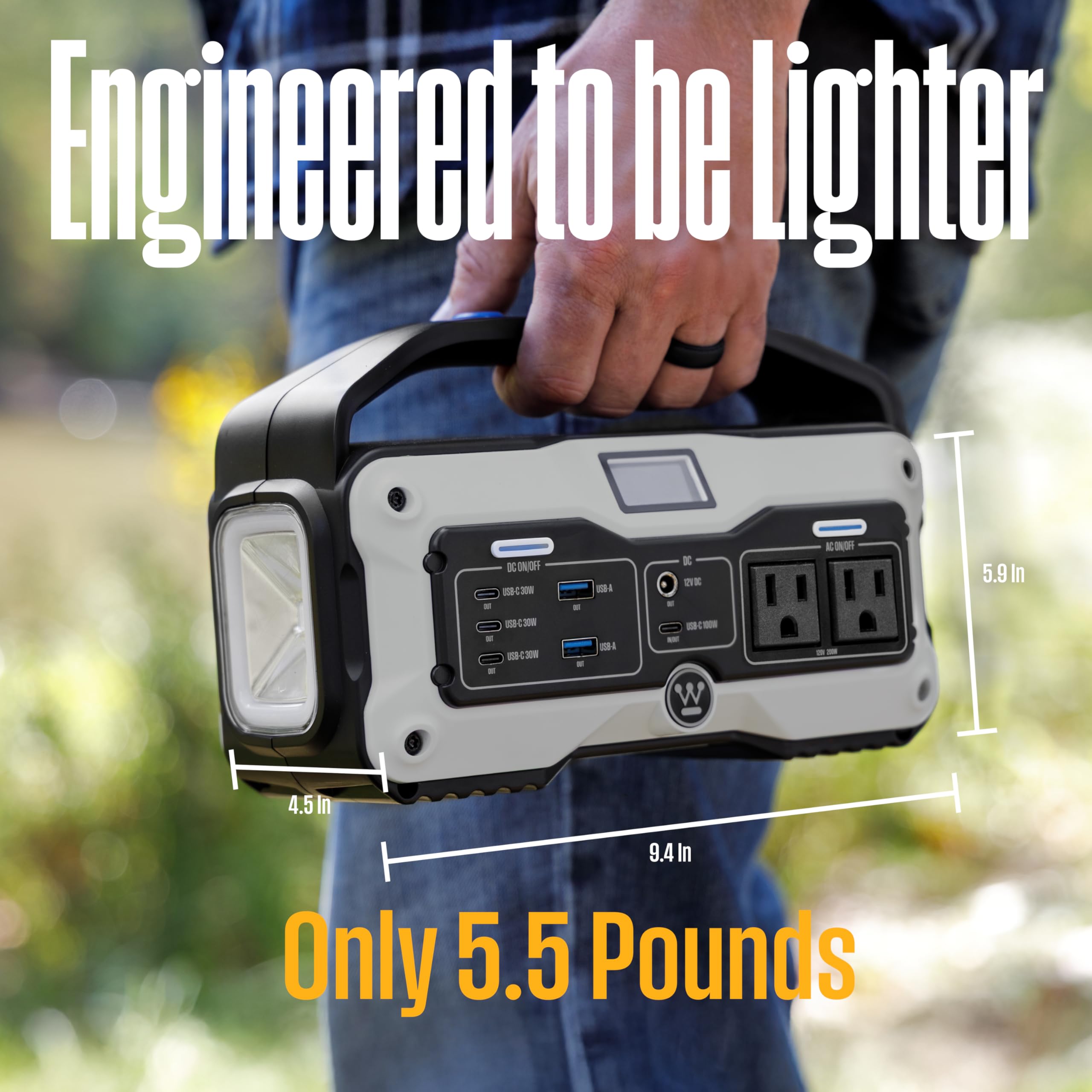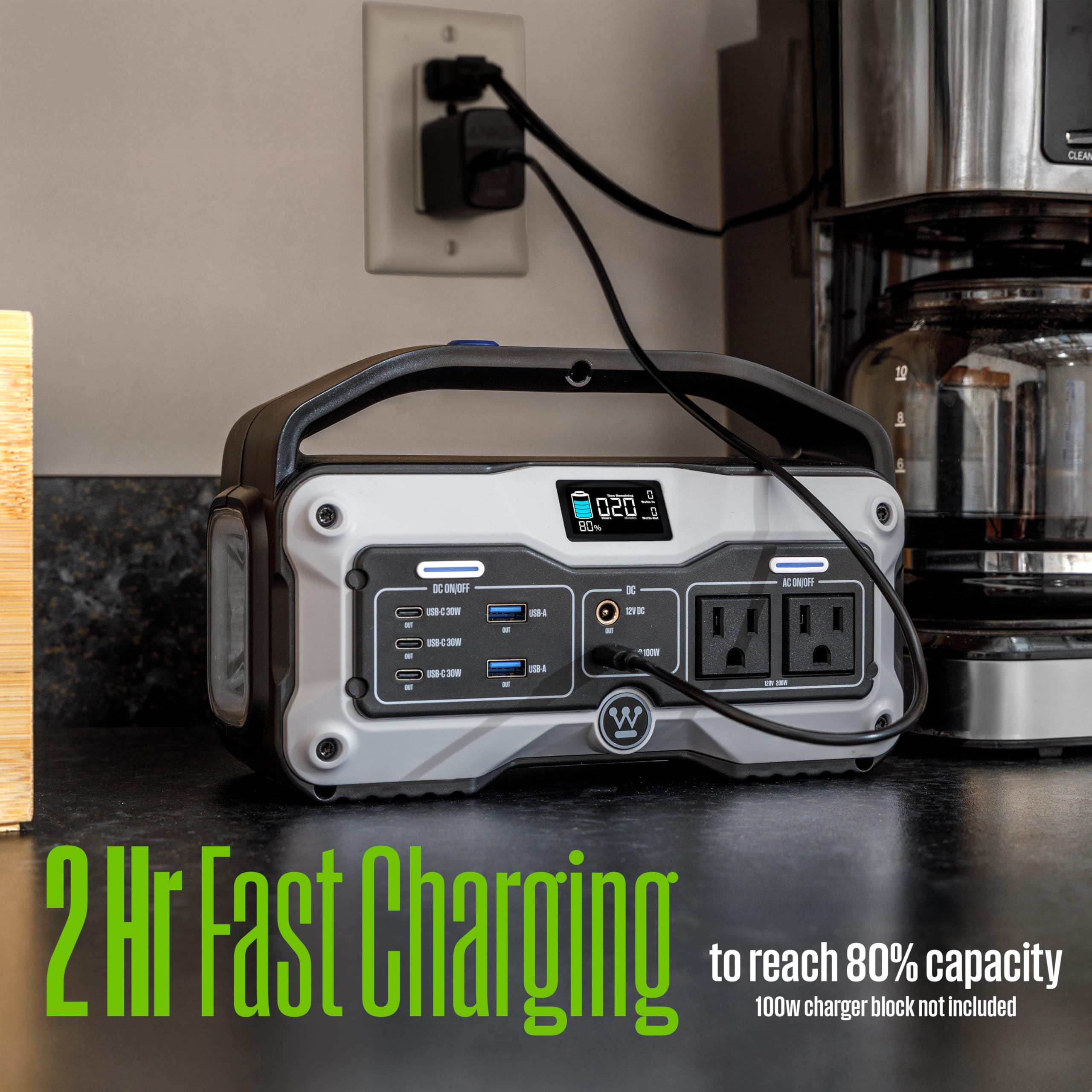 The small and lightweight Westinghouse iGen400s portable power station is made for indoor and outdoor use for both emergencies and convenience. It delivers safe, quiet, fume-free power and charges to 80% in 2 hours from a 120V outlet with included USB-C cable with a 100W adapter. Adapter not included. Around the house, it's the easy way to power everyday electronics, phones and laptops if you don't want to deal with hard to reach outlets, extension cords, and when you're spending time on the deck or in the yard. Get reliable emergency power during home blackouts—it's especially good for apartment dwellers experiencing building-wide power issues. A top handle makes it easy to carry, so it's great for activities like camping, RVs and tailgating. Ideal for in-car use during road trips because it's quiet and simple to operate for all. Includes a tri mode LED flashlight and an emergency flasher. With 184 watt hours of lithium battery capacity, 200W running and 400W peak output, the iGen400s has multiple connection options like dual AC outlets, high speed USB-C and USB-A ports, plus a 12V DC outlet and car charger adapter to keep many devices running at once. An LED display shows information including exact battery level, recharging time and watts out, so there’s no guessing. Built in protections provide safety, better operation and long battery life for many cycles of maintenance-free power, all backed by a 2 year limited warranty and lifetime Westinghouse technical support.