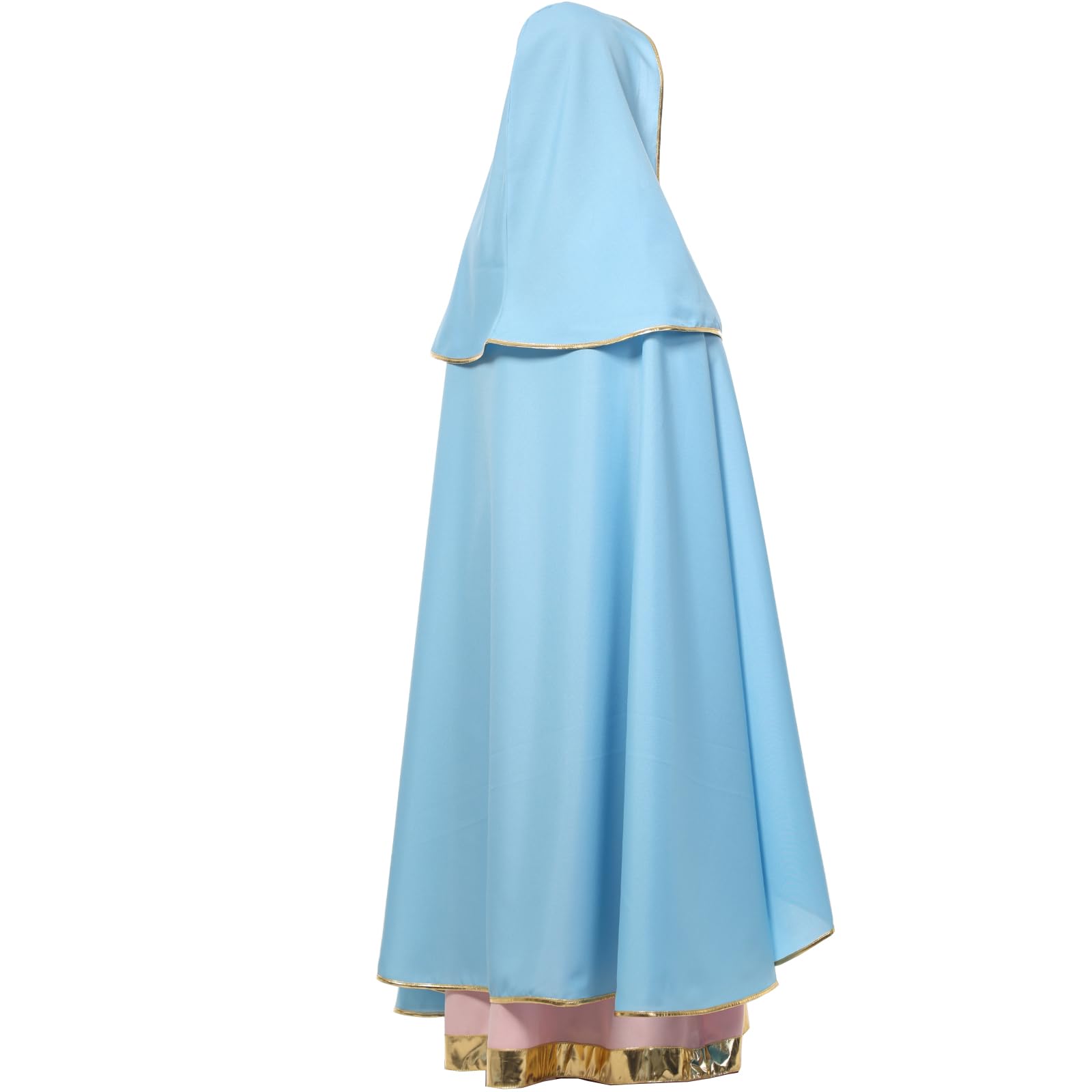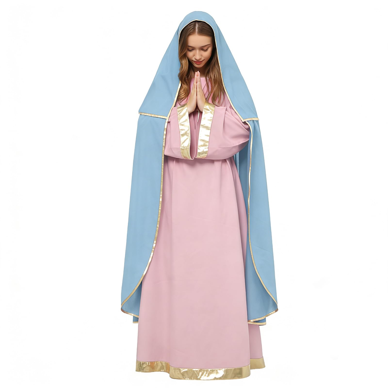 Classic Design: Features a traditional Mary-inspired look with a flowing robe, cape, and gold trim. The loose fit makes it easy to put on and allows comfortable movement during performances