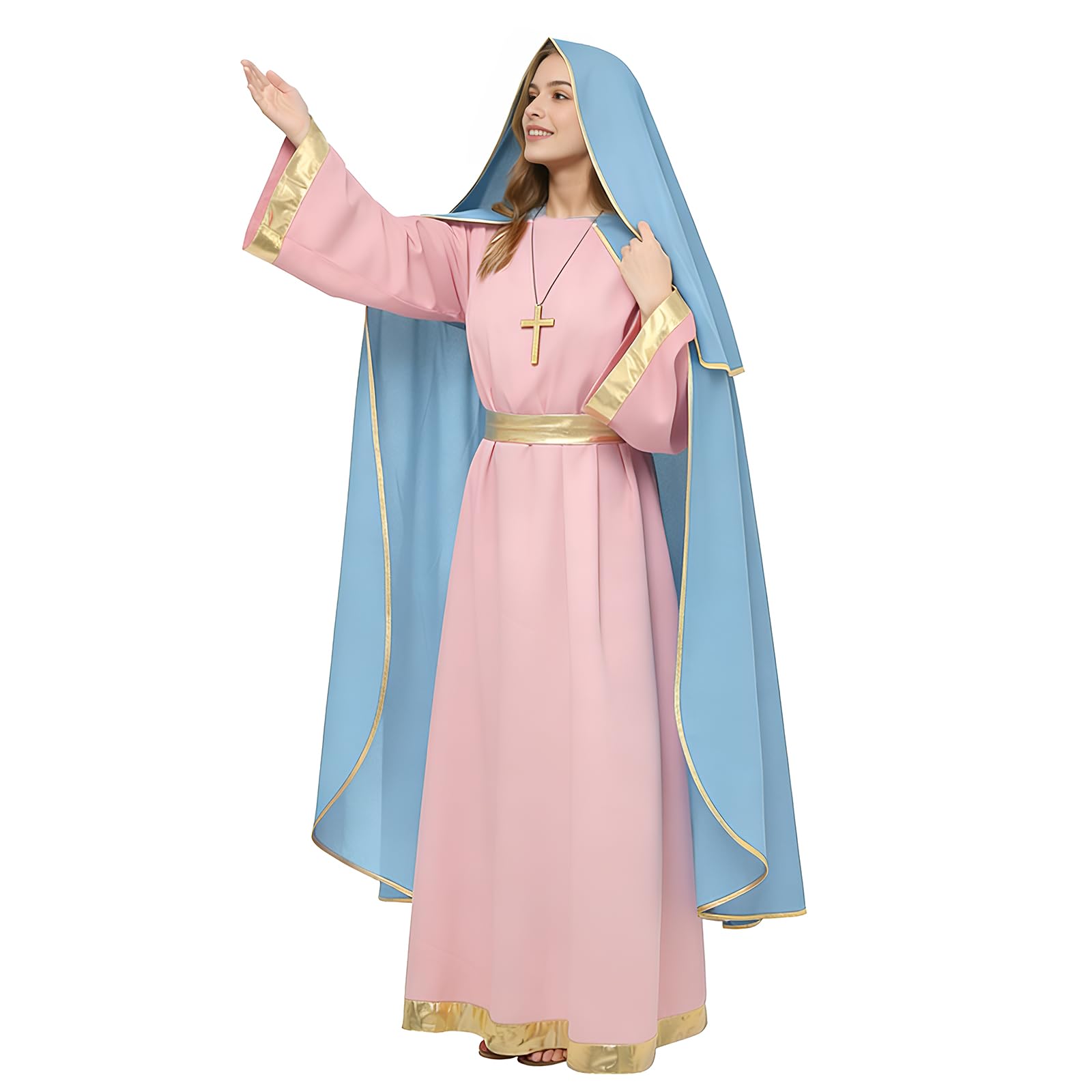 Package Includes: This adult Mary costume set includes a long robe with cape, a headscarf, a golden belt, and a cross necklace. Everything you need for nativity plays, church performances, Easter pageants, or other biblical-themed events