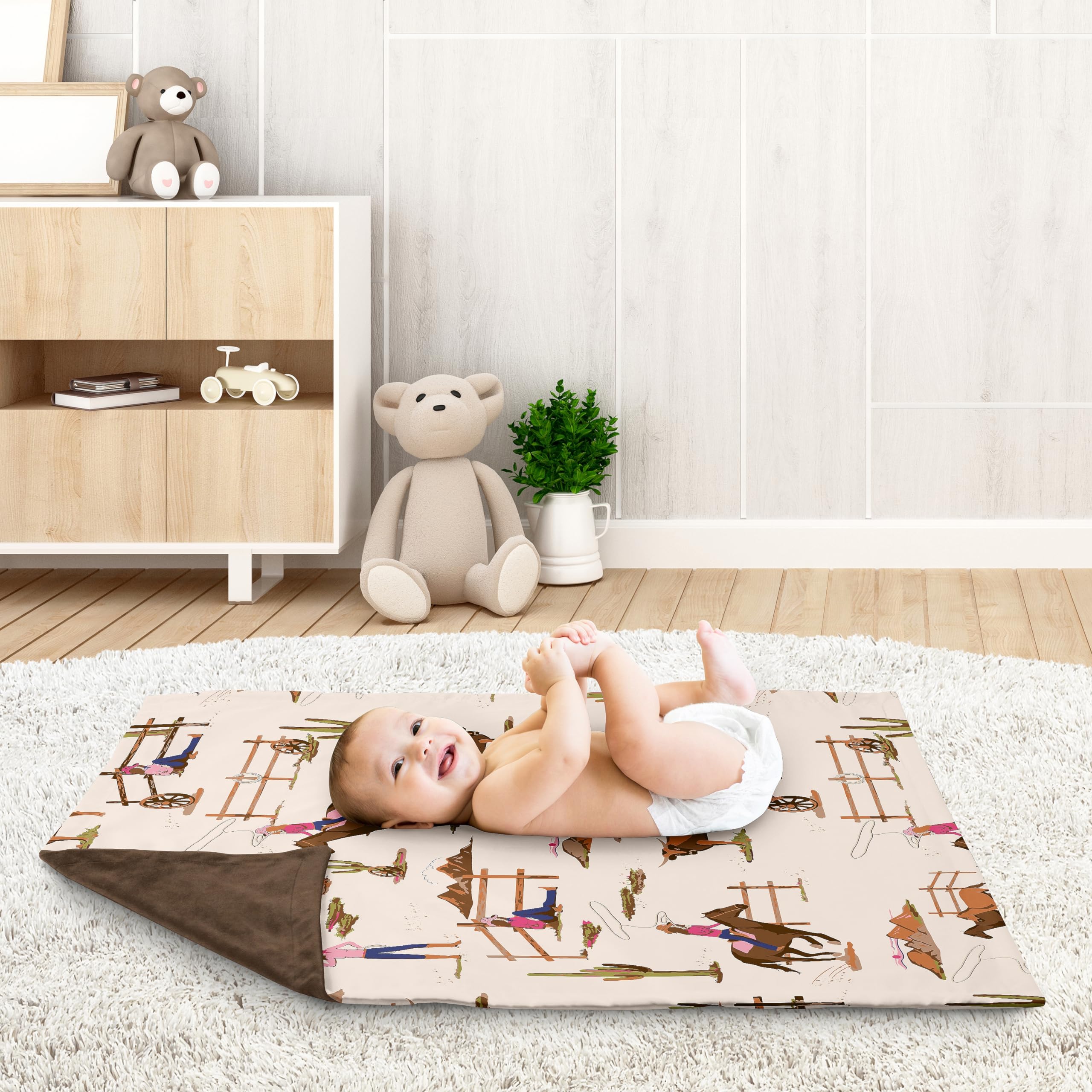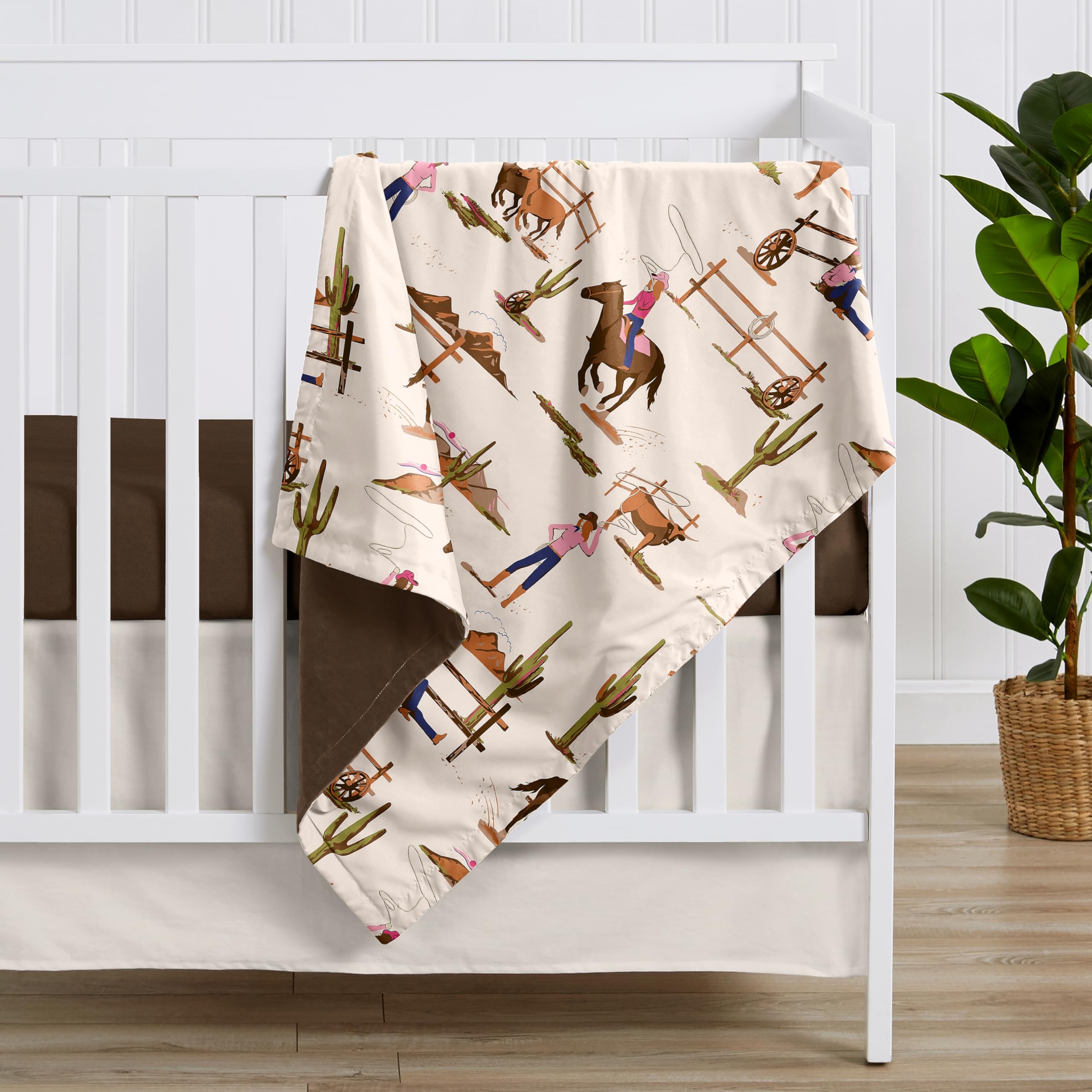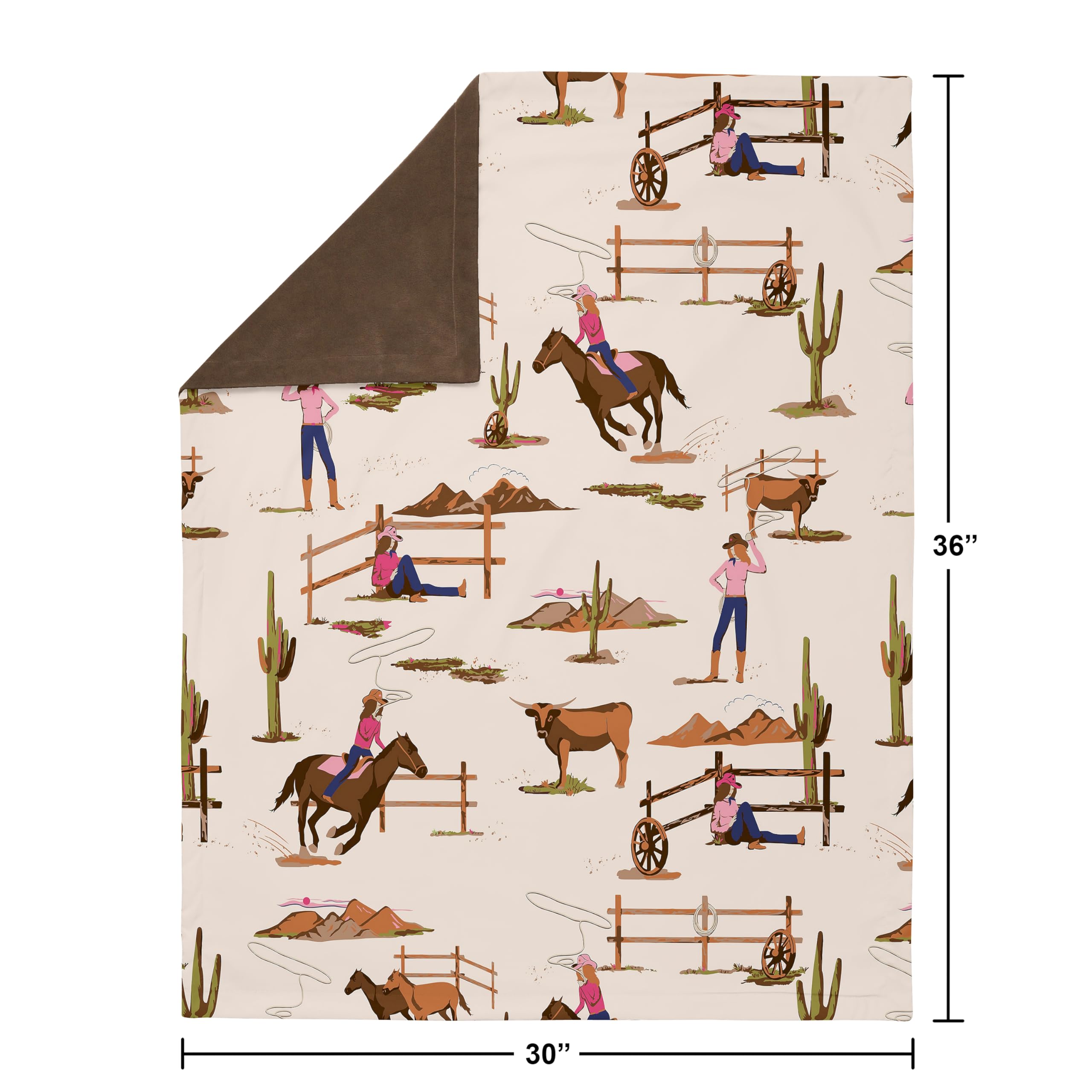 Blanket is designed using a light pink, brown, beige, blue, cream, taupe, tan and off white wild west vintage country retro animal horse southwest western cowgirl brushed microfiber print and reverses to soft brown minky
