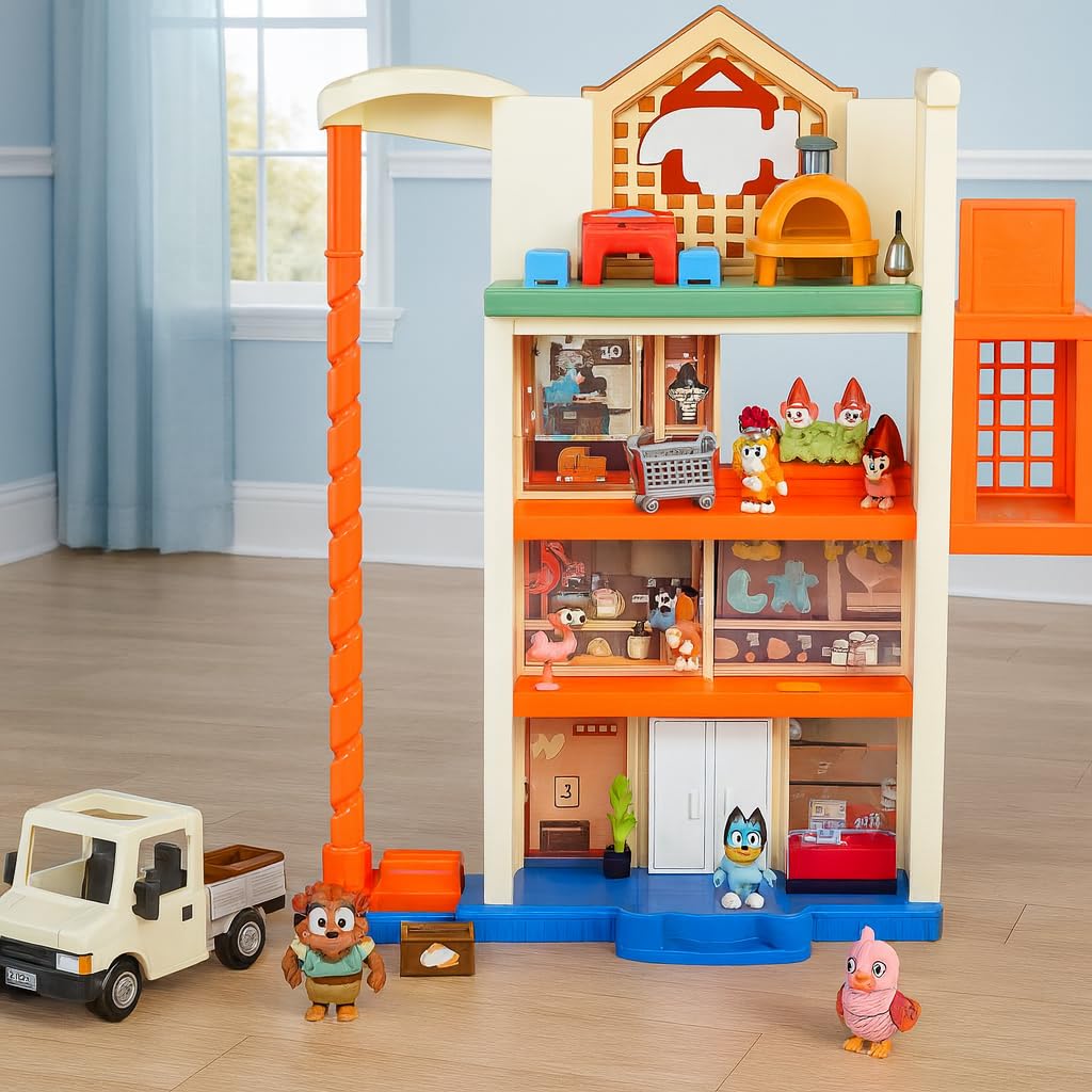 Bring home the fun of the hit TV show Bluey with the Bluey Hammerbarn Shopping Center Mega Set Exclusive! This playset stands at over 22" tall and comes with 3 figures - Hammerbarn Bluey, Shopping Bingo and Tradie. Your child will have the best shopping adventure ever as they push the shopping trolley around the Hammerbarn. There is even a garden gnome figure for the girls to buy! Your little ones will love exploring the 9 different play areas loaded with fun features in this enormous playset. There is a real working lift to place Bluey and Bingo in so they can ride up and down to the 4 different levels. Plus there is the best Shopping Trolley Return ever. Your kids will love watching the trolley spin around as it returns to the ground floor! With plenty of lights and 45+ sound effects, this playset brings the action to life! Your kids will love pressing the Paw Button to activate the lights and hear different phrases from the TV show. The Hammerbarn Shopping Center Mega Set also comes with a Ute vehicle for the Tradie to drive! There is a whopping 15 accessories included in the set and heaps of stickers to decorate the Hammerbarn with. The Hammerbarn Shopping Center Mega Set is the perfect addition to any child's Bluey toy collection. Measuring 2.5-3" in height, the figures are just the right size for little hands. With Bluey's Hammerbarn Shopping Center Mega Set, shopping has never been so much fun!
