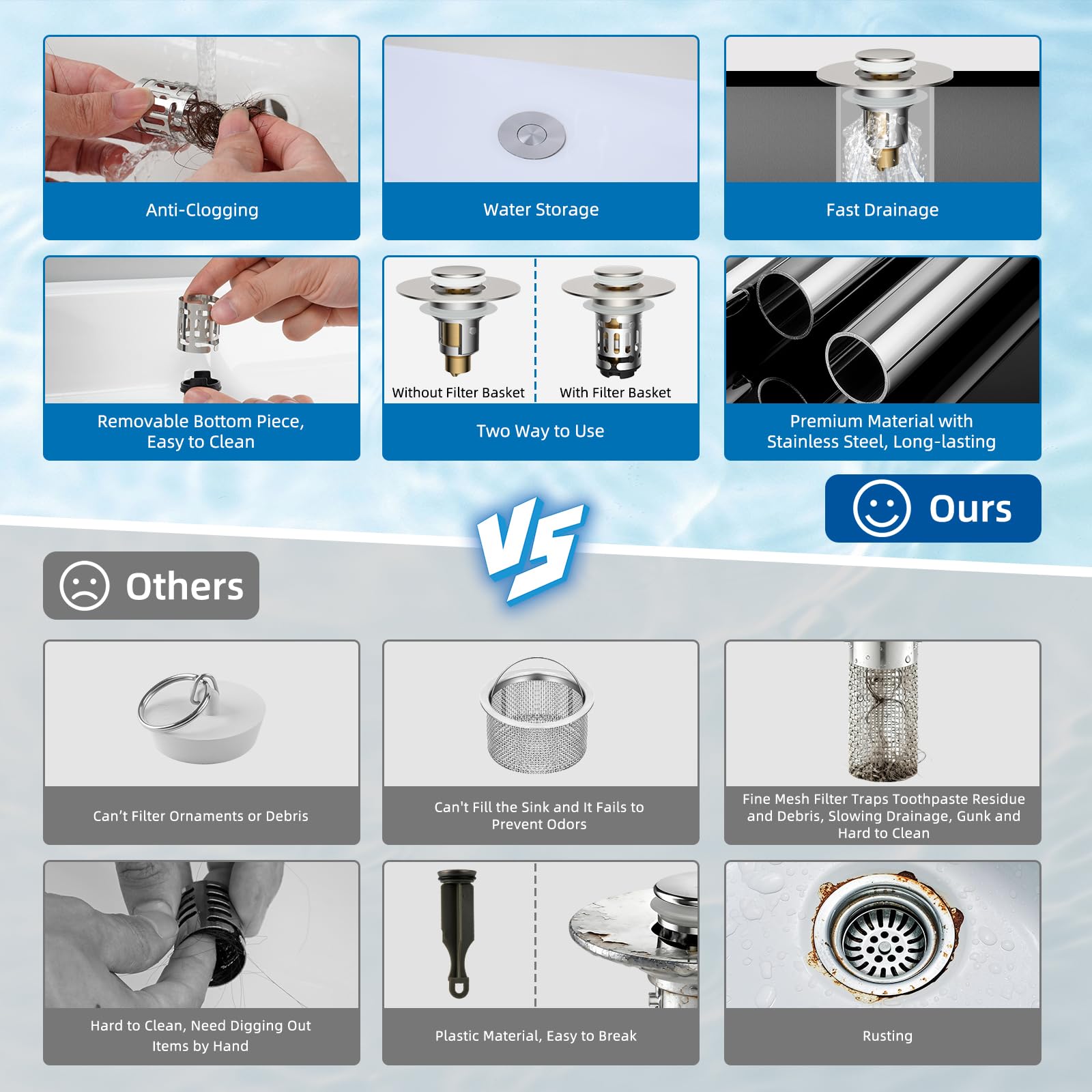 [Pop-up Design] Our pop-up sink drain strainer is made of high-quality stainless steel, plastic, and solid brass, providing exceptional rebound strength, corrosion resistance, and long-lasting durability. It features a long-lasting and sensitive pop-up brass bullet core mechanism, allowing you to easily switch between the water storage and fast drainage modes with just a gentle press