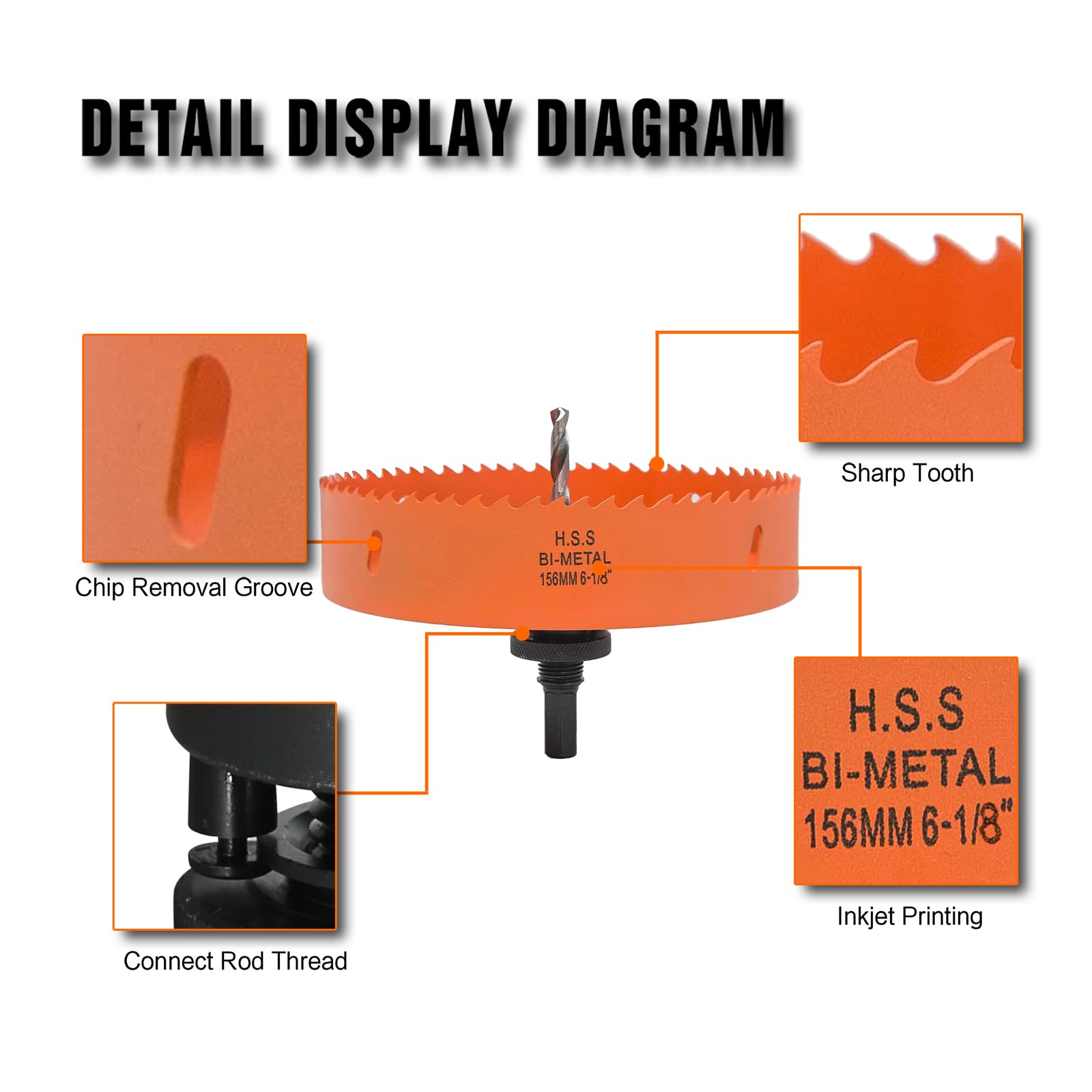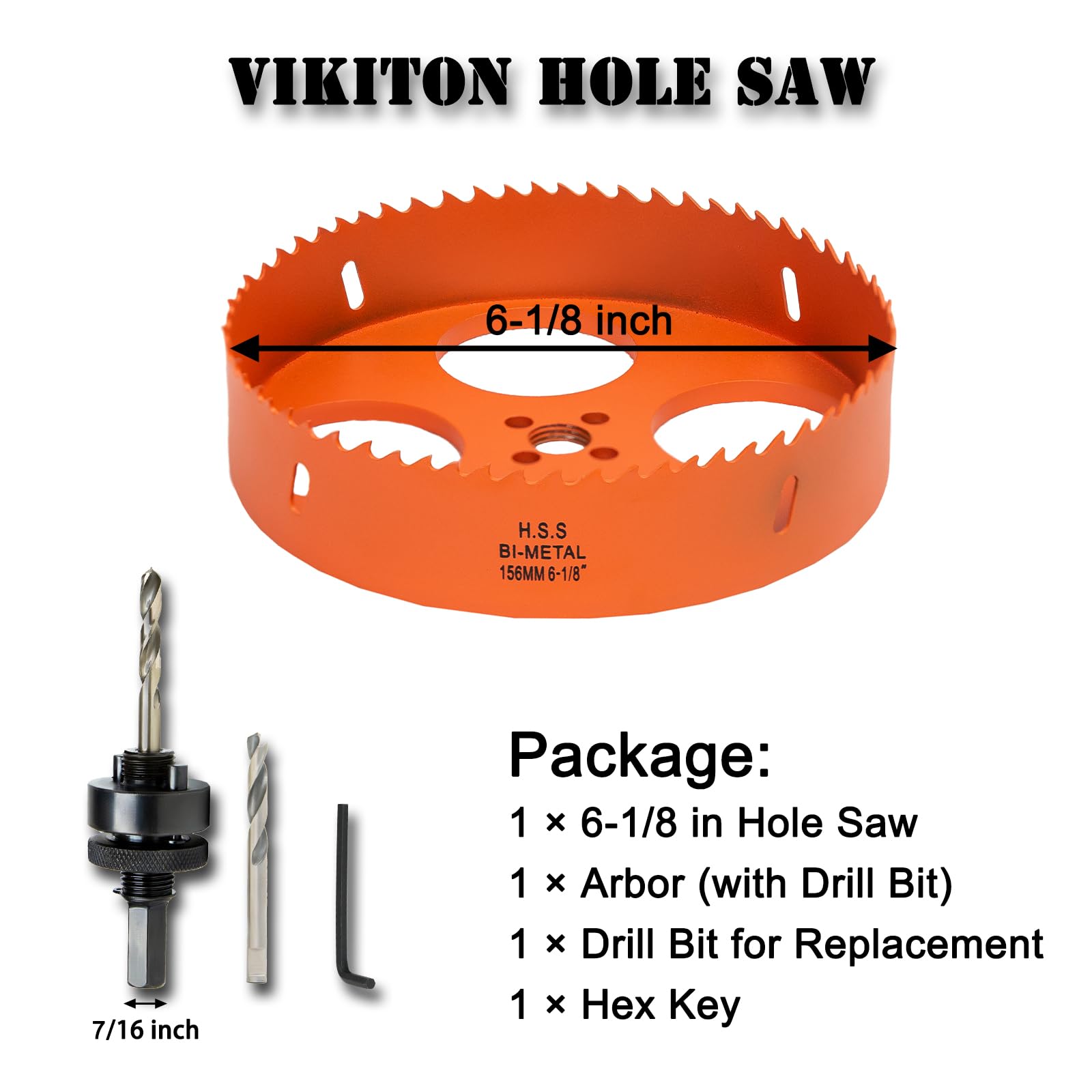 Package Include: 6-1/8 in hole saw, 1 pc arbor(with 1 drill bit), 1 pc drill bit for replacement, 1 pc hex key