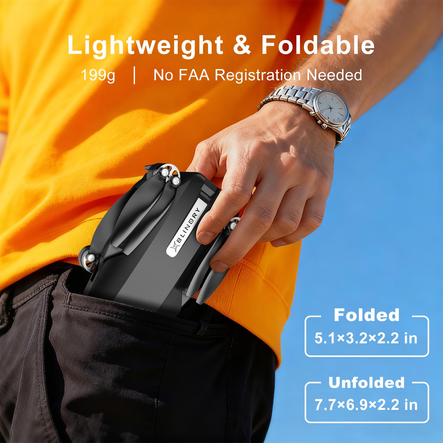 Beginner Friendly with Multiple Functions: You can easily control the foldable drone by remote control or "BLINORY GO" app. It features numerous intelligent functions for easy operation, including optical flow positioning, altitude hold, headless mode, three-speed modes, one-key takeoff/ landing/ emergency stop, 360° flips, trajectory flight. For gesture control, just make a "V" gesture for photos and use a palm gesture for videos. These multiple functions make it extremely beginner-friendly.