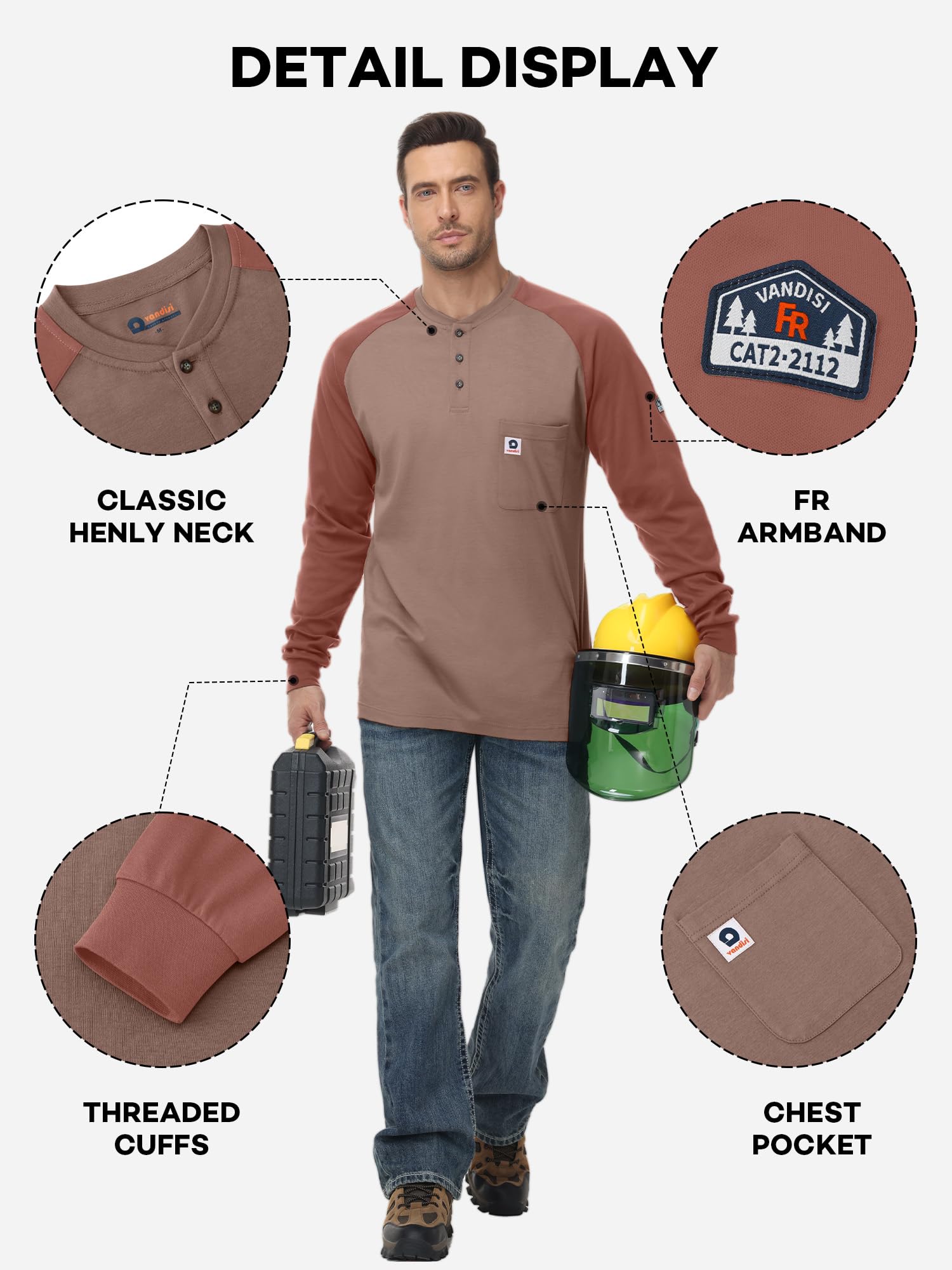【Humanized Design】The Vandisi CAT 2 FR shirt features high-density seams and thermal transfer labels neckline for a true comfort experience. Henry collar and rib knit cuffs, enhanced fabric durability and stretch provide ease of movement and longer-lasting wear. Raglan sleeves significantly improve the fit of the shirt, 1 left chest pocket and 1 sleeve pocket for great convenience!