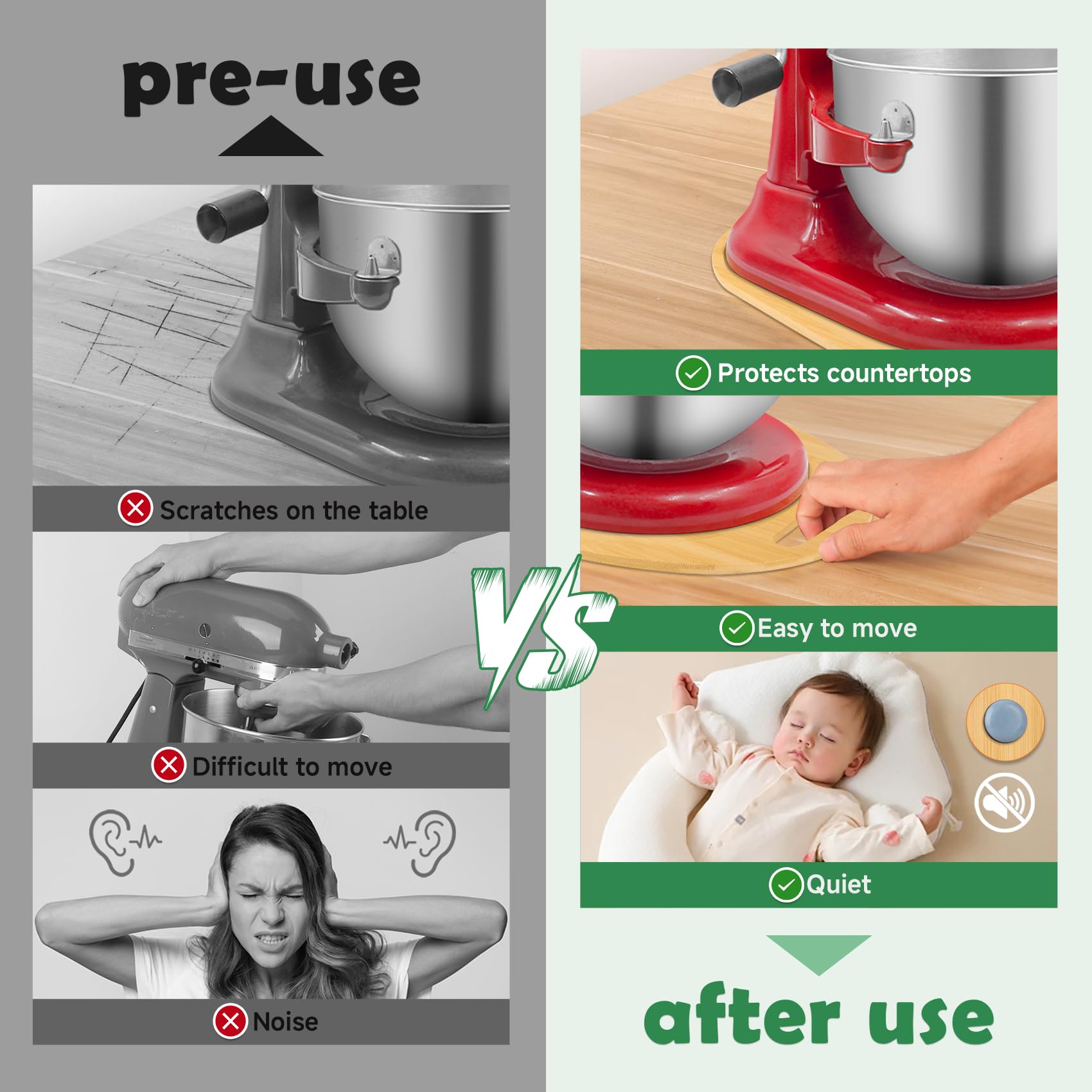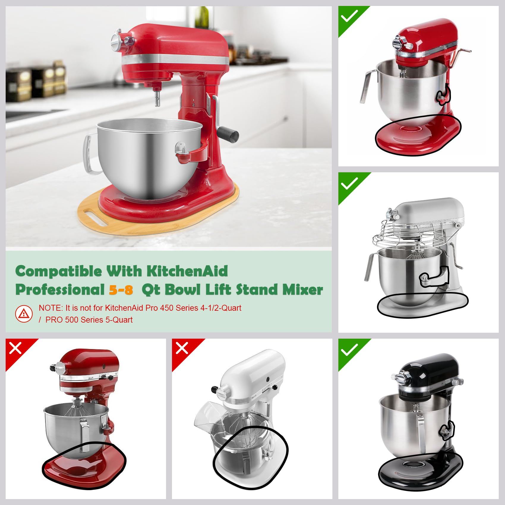 【Compatible with】 This Sun3drucker Bamboo Mixer Mat Slider is specially design for KitchenAid 5-8 Qt Professional Bowl Lift mixer, It is not for KitchenAid Pro 450 Series / Pro 500 Series