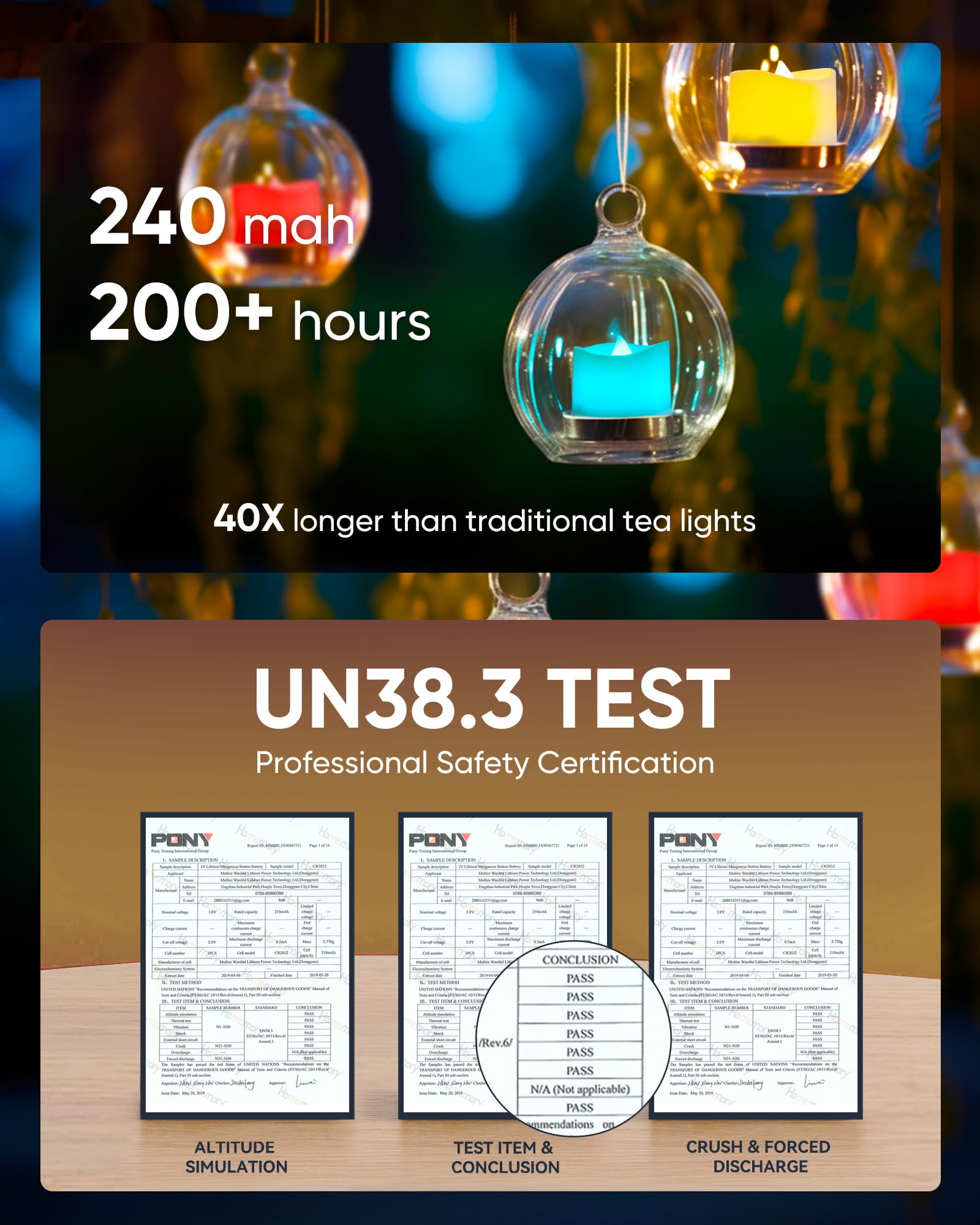 RELIABLE & SECURE: Homemory LED tea lights are tested rigorously, ensuring their reliability. With (UN38.8) internationally certified batteries and healthy polypropylene materials, plus a secure battery cap design, we care about your safety