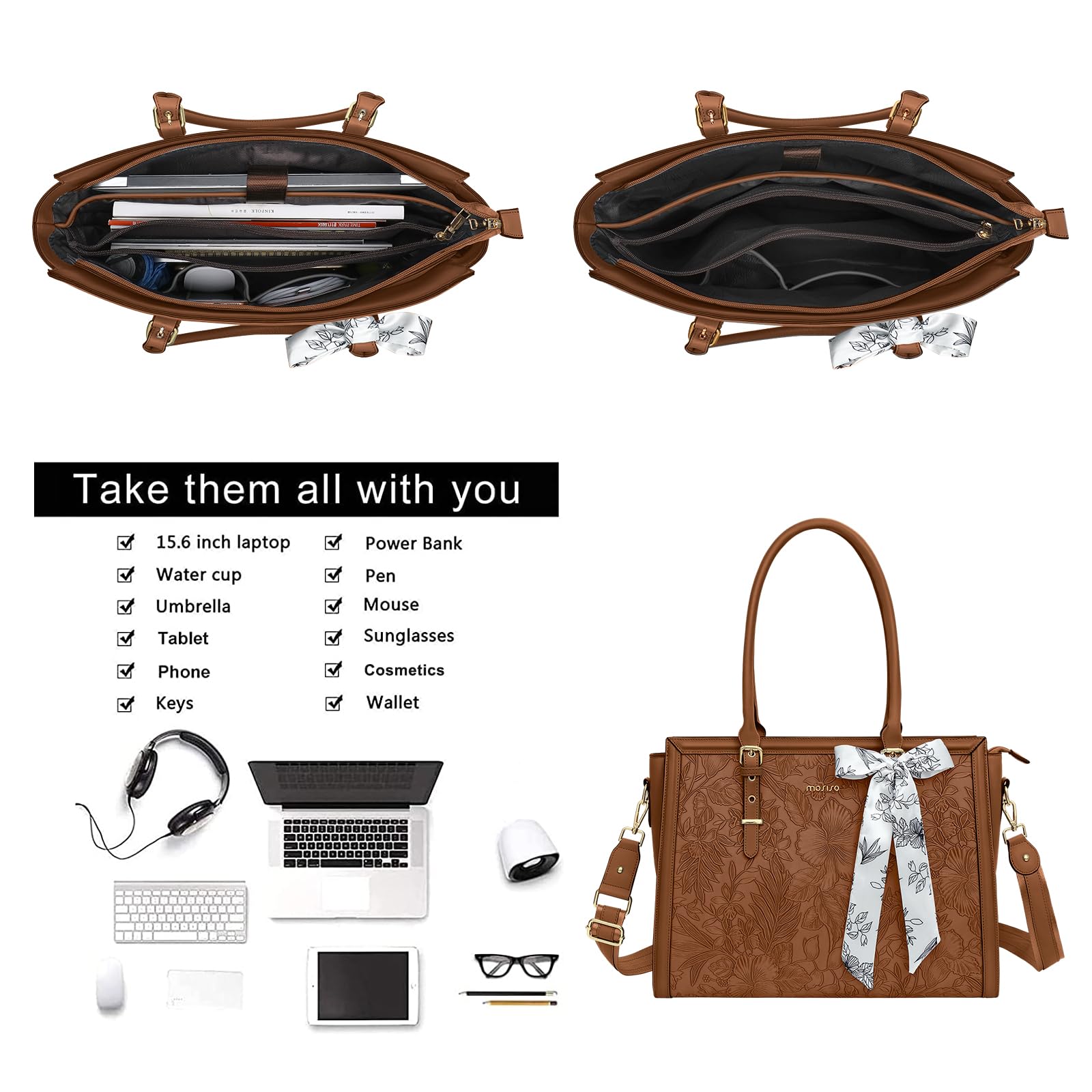 Roomy enough with 3 compartments for all your daily stuff. The computer compartment in the middle provides a thick padded foam section with a hook & loop strap closure for your laptop or tablet. Professional design to protect your laptop against accidental impacts and scratches. The other two side compartments & matching color small pouch case can store your jewelry, mobile phone, keys, mouse, passports, credit cards, cash, makeups and so on