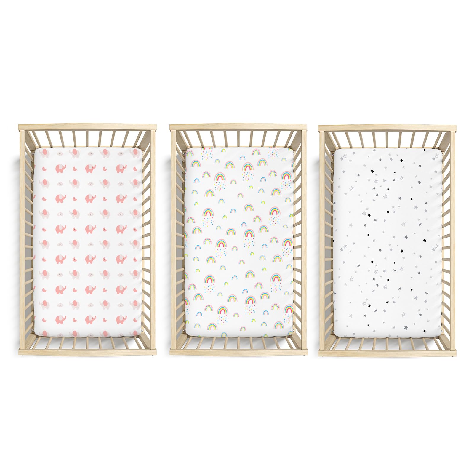 Bright Pattern:Including colorful rainbow,pink elephants, stars patterns and pink 3-piece, these crib sheets girl are vibrant, cute and perfect for a little girl,which makes such an adorable addition to her nursery.