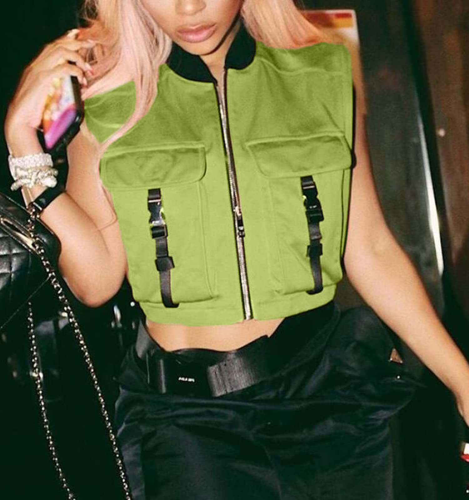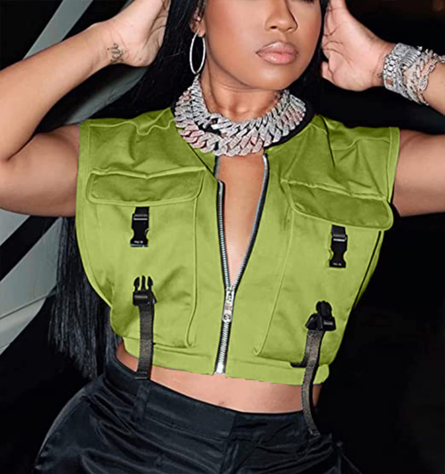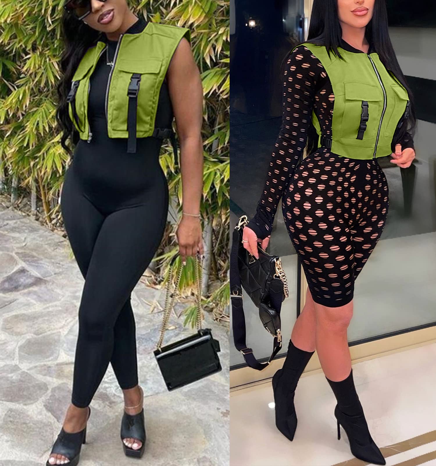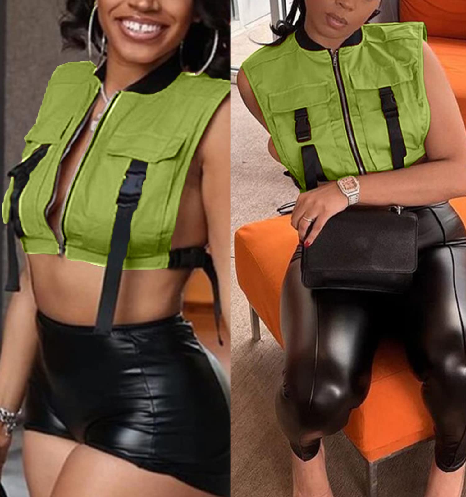 Features:The sexy sleeveless zip jacket is buckle and metal zip up closure, two flap chest pockets, bomber jacket collar, solid color, both two sides completely hollowed out with adjustable buckle make you look more sexy and fully show your feminine charm.