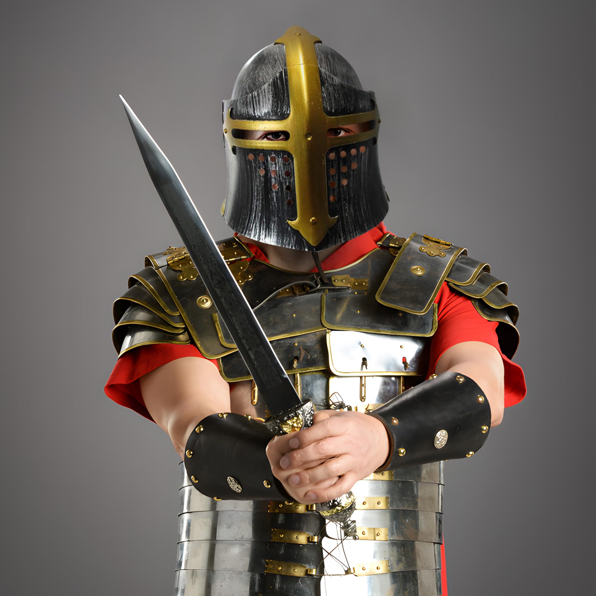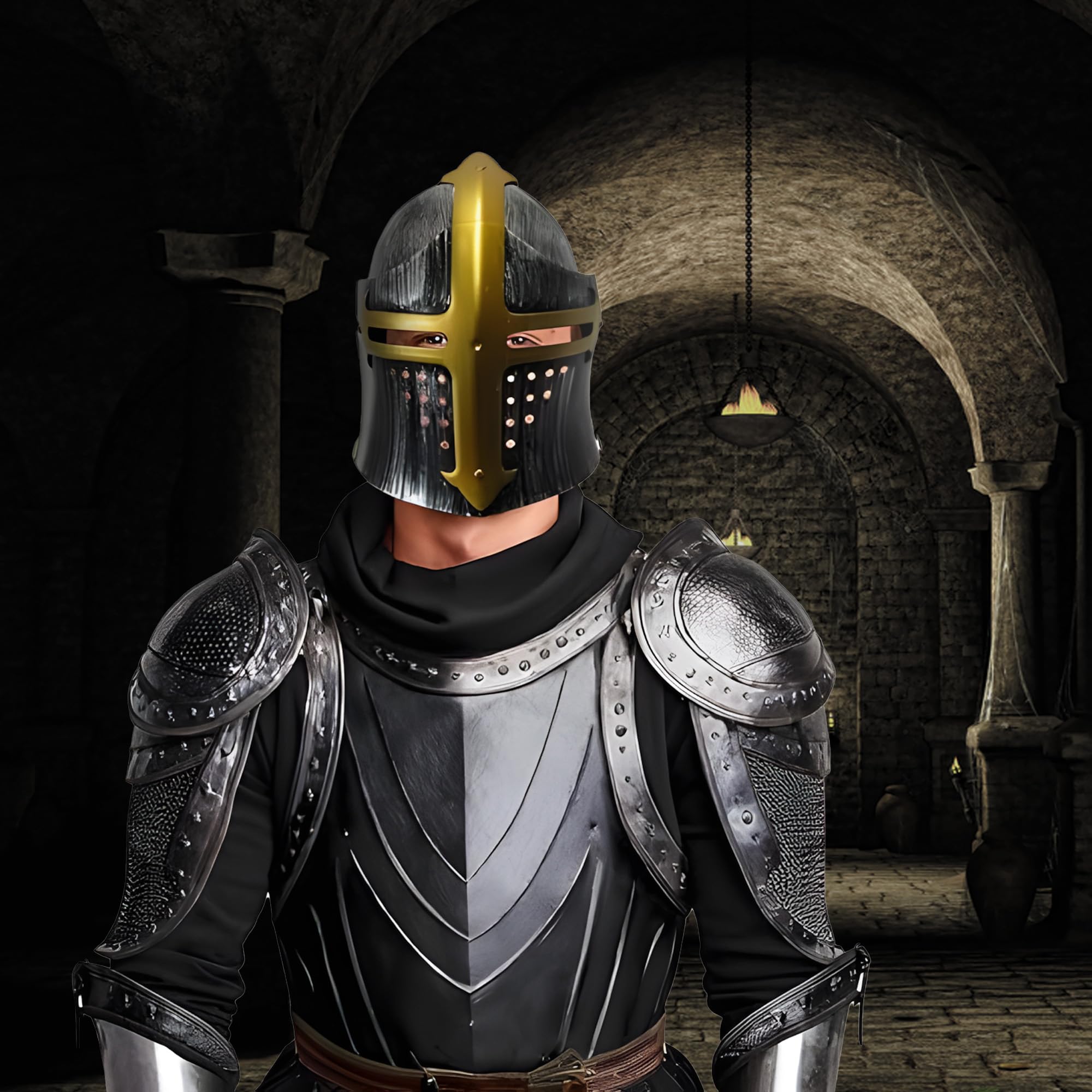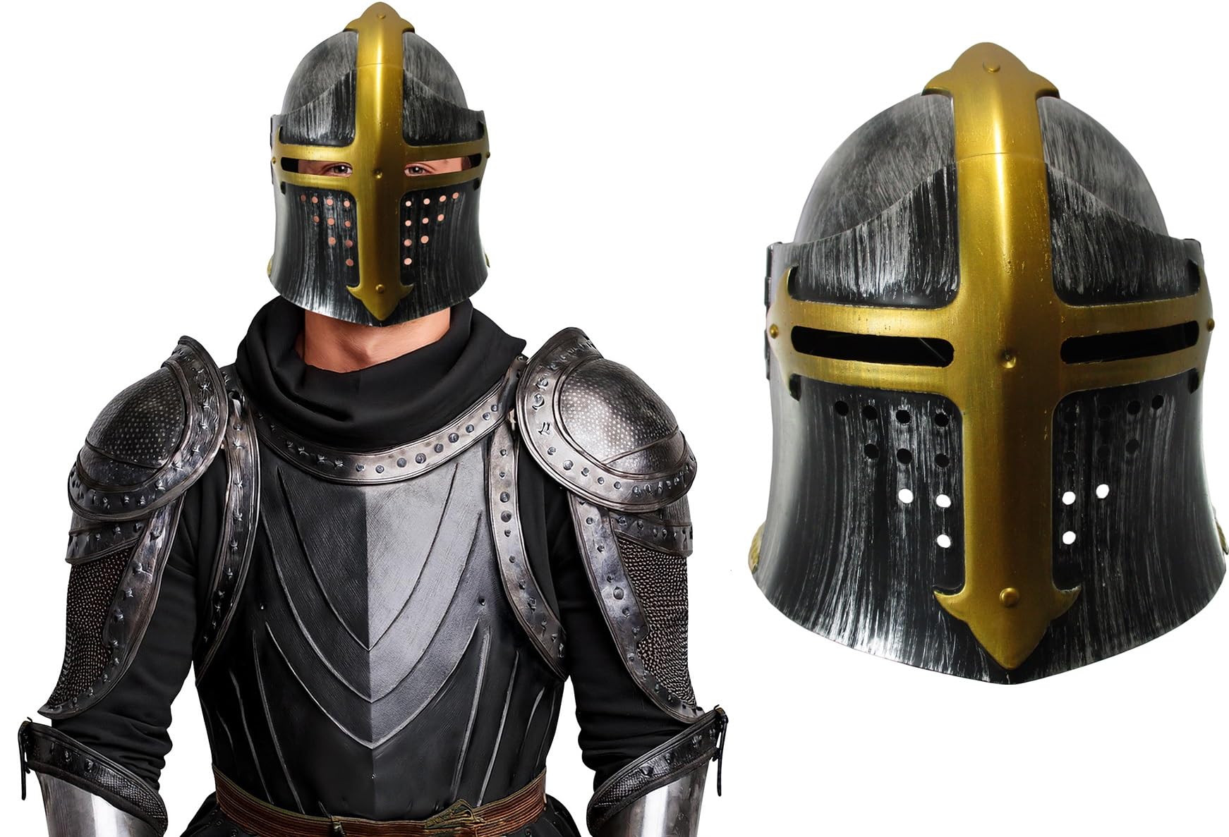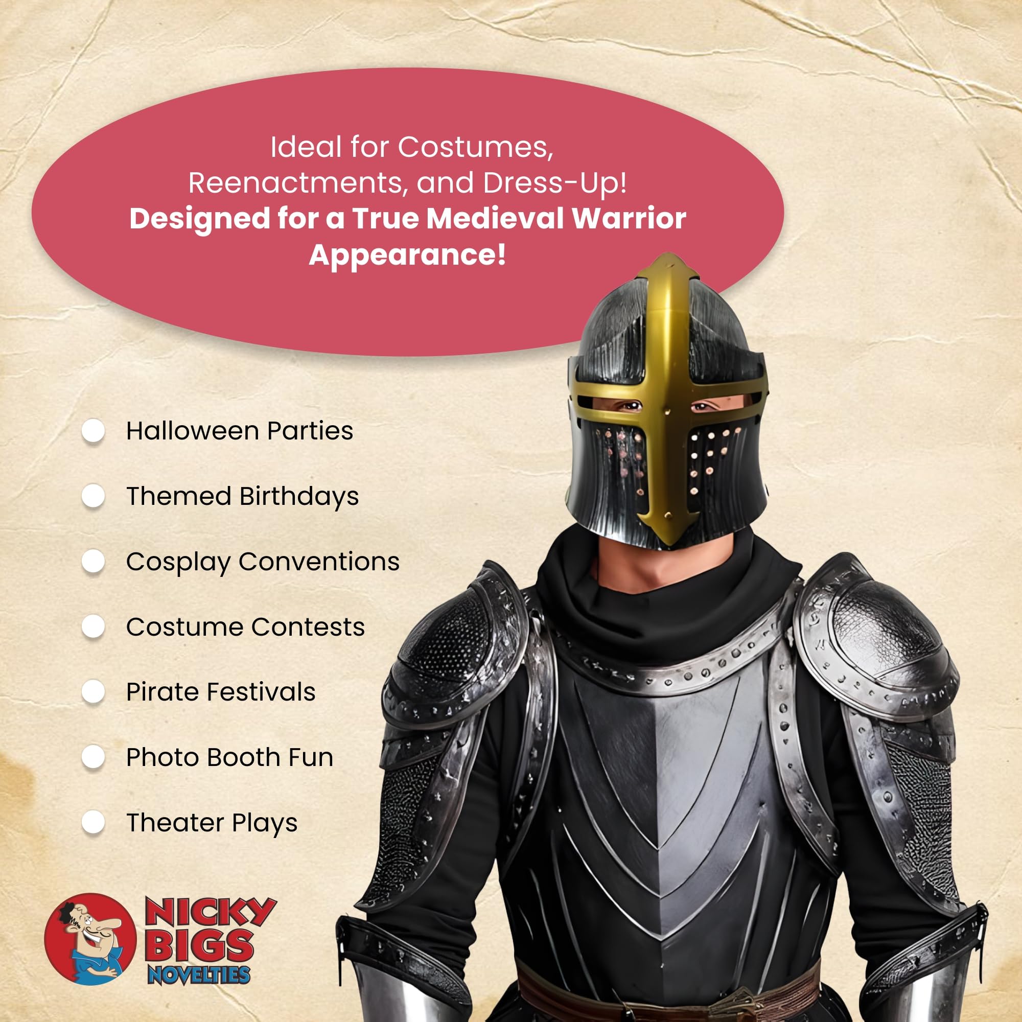 Description Step into the age of crusades and chivalry with the Nicky Bigs Novelties Medieval Templar Knight Helmet, a striking tribute to the legendary great helms worn by noble knights of the 13th century. Meticulously crafted from thick yet lightweight plastic, this costume headpiece captures the essence of medieval warfare with a bold front faceplate featuring a gold cross design — the symbol of the Templar knight — available in either weathered silver or sleek matte black. Designed for both realism and functionality, the hinged visor flips up smoothly, allowing wearers to easily lift the face mask during roleplay, performance, or costume breaks. This detail adds not only visual drama but practical comfort. Whether you're heading into a costume battle, dressing up for a Renaissance festival, or taking your cosplay to the next level, this helmet is a versatile choice. Sized for small adults and teens, the helmet has an internal circumference of 56–57 cm and stands approximately 8 inches tall, with exterior dimensions of 8.25" W x 8" H x 10" D. The interior can be adjusted for a snug fit using adhesive foam strips (not included), making it ideal for extended wear. While this helm isn't made of metal, its textured surface and hand-painted finish give it an impressively realistic appearance — perfect for capturing the look without the weight. Please note, due to the manufacturing process, minor imperfections like small scratches or slight paint variations may be present, adding to the authentic battle-worn effect. For ages 14 and up. Spot clean only. Whether you’re charging into imaginary battle or stepping into character for Halloween, the Nicky Bigs Novelties Crusader Helmet is your armor of choice for timeless warrior style.