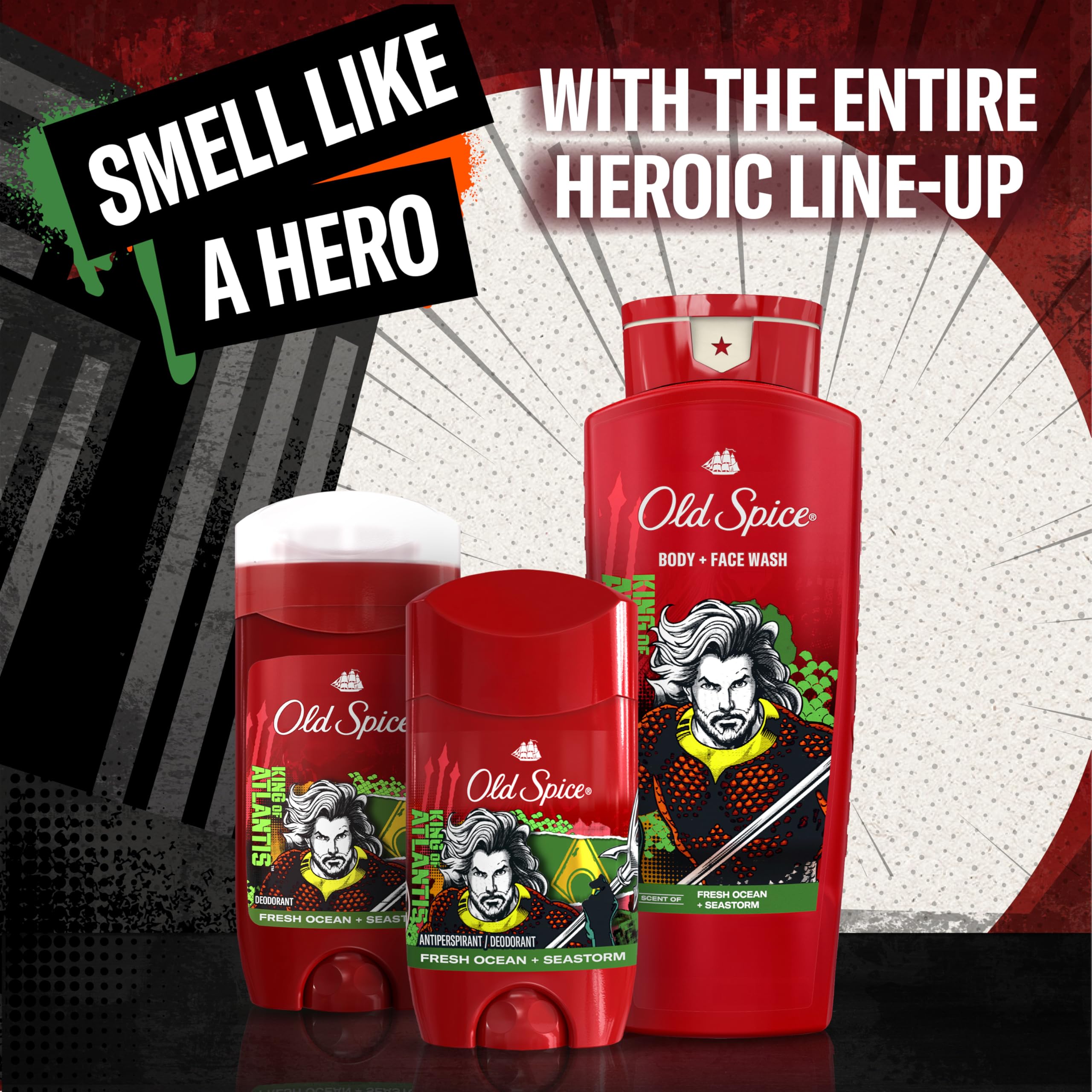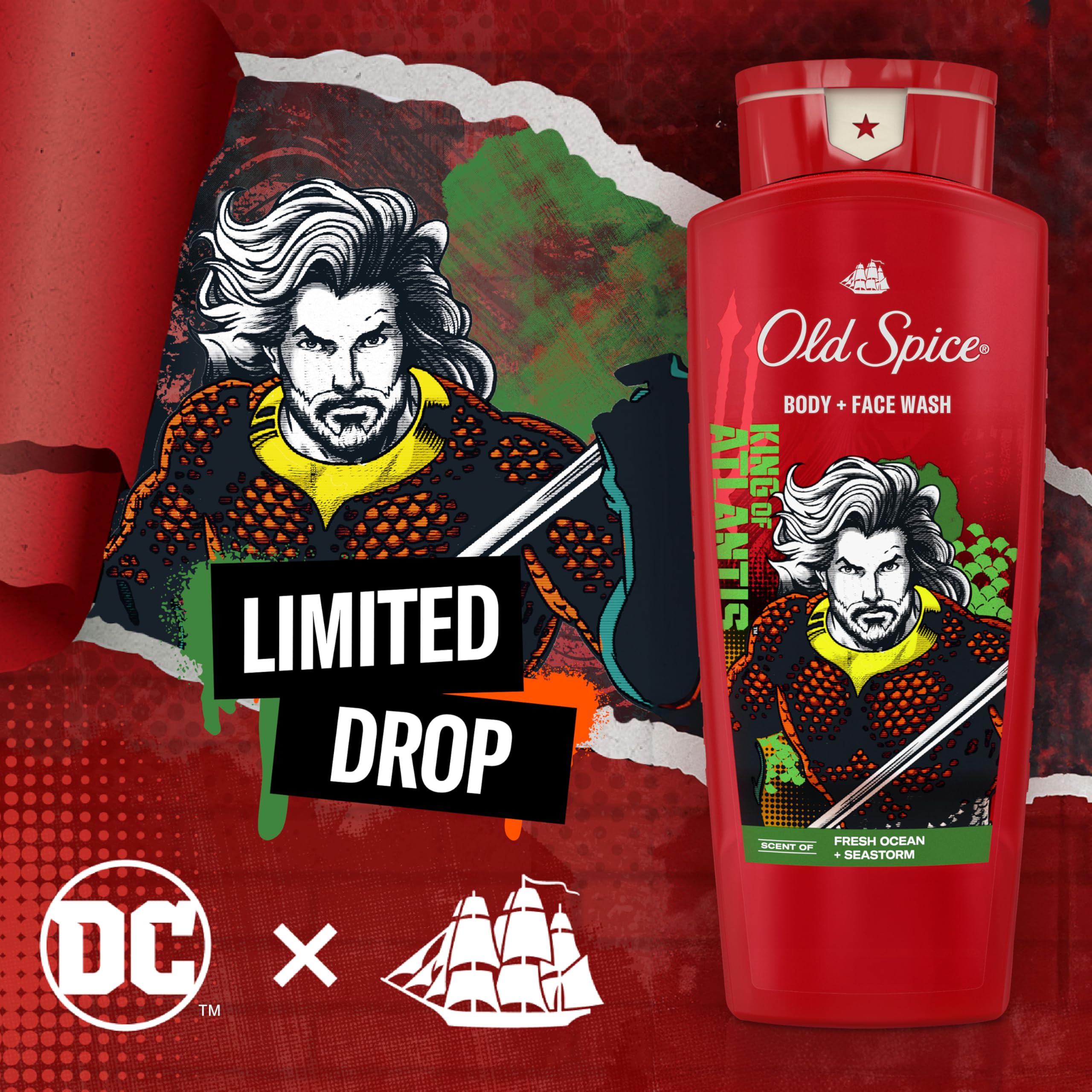 Smell like a strong and courageous King of Atlantis™…not a sweaty dude. Old Spice x DC Aquaman™ Body and Face Wash for men is a cleansing body wash with a rich lather that washes away dirt and odor and has a ridiculously long-lasting scent. This Limited Edition body wash is specifically formulated as a 2n1 for your body and face to provide 24/7 shower freshness. Smell like a Hero with the King of Atlantis™ inspired scent of Fresh Ocean and Seastorm.