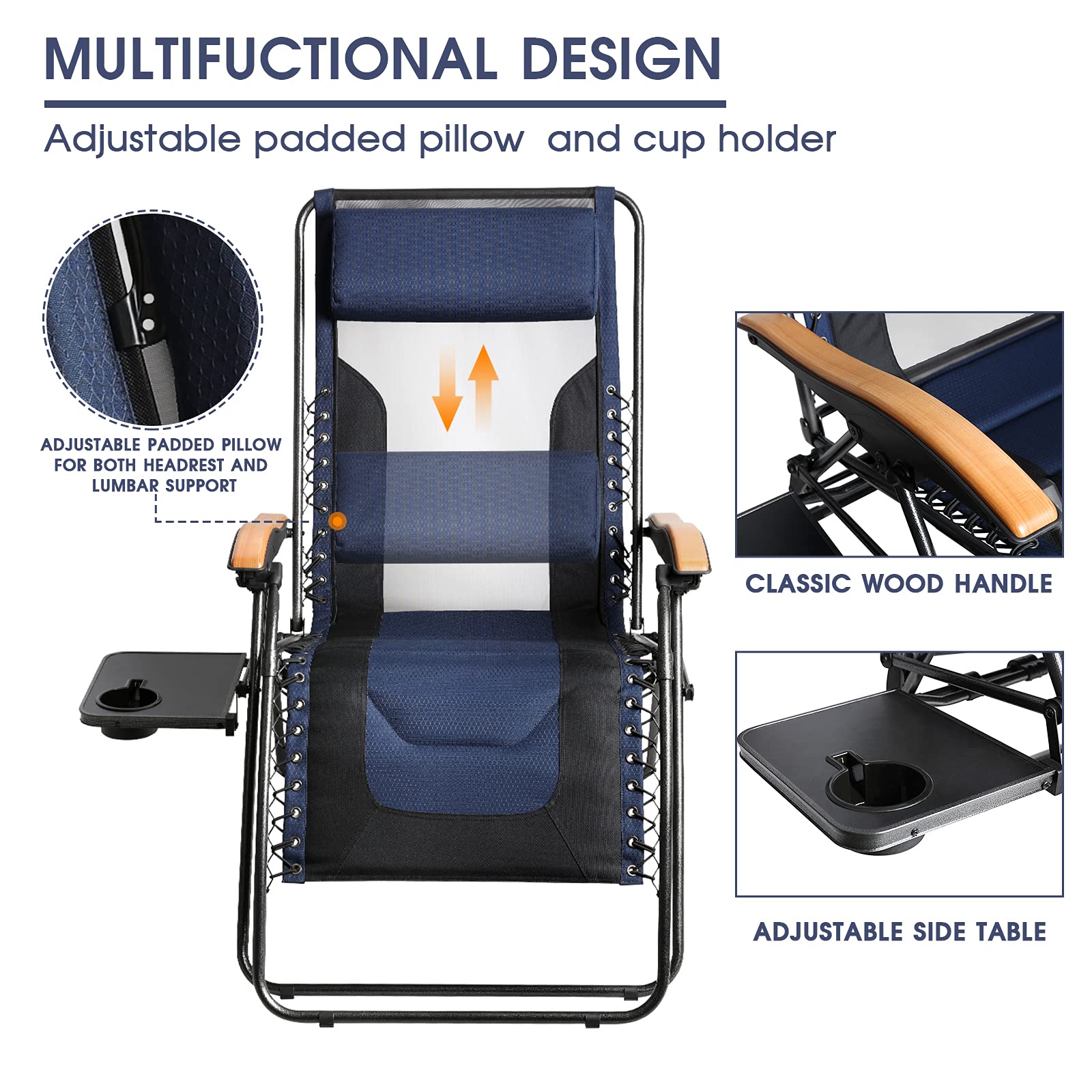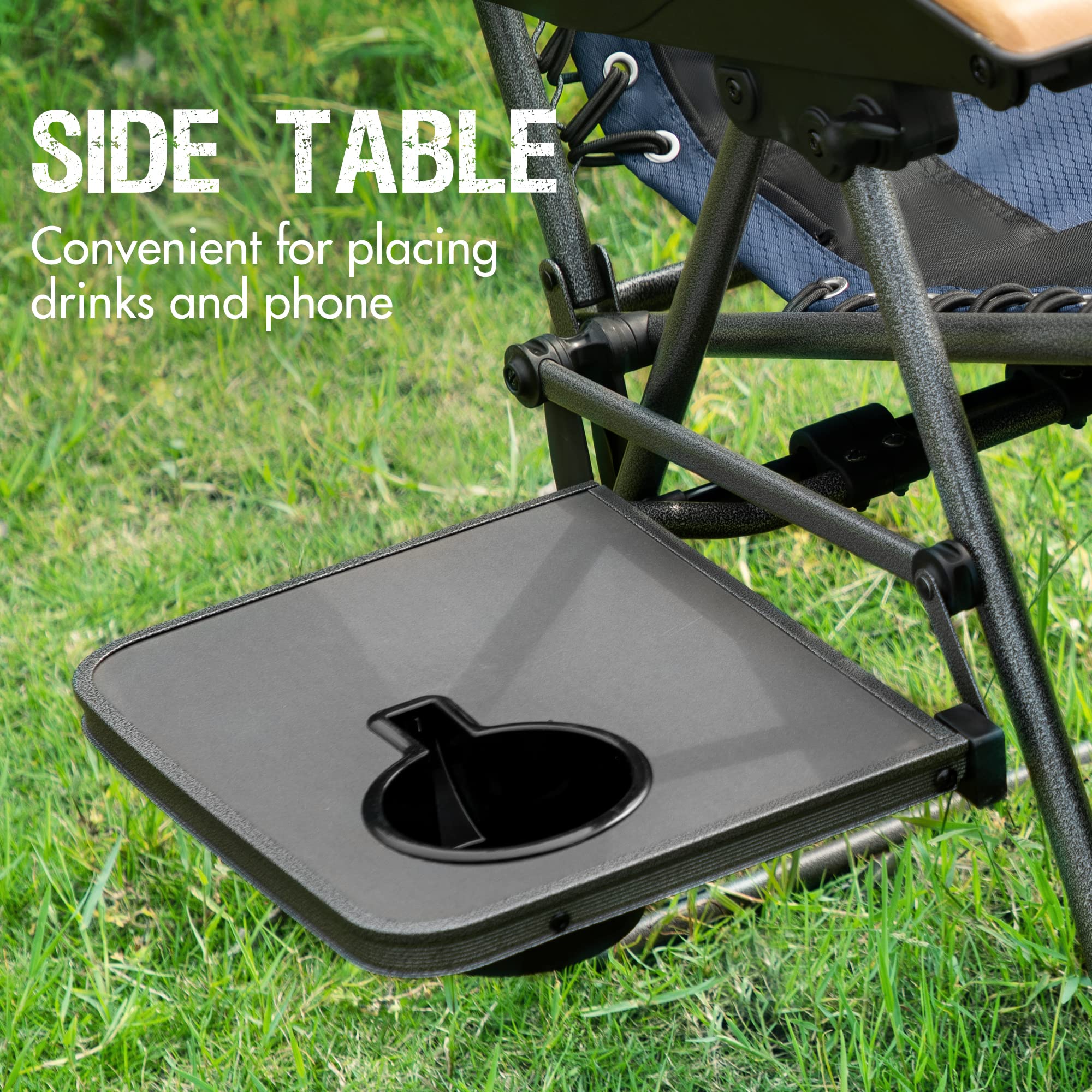 COMFORTABLE & CONVENIENT LOUNGE CHAIR: Fully padded seating, adjustable pillow for head or lumbar support, and plastic armrests with wood grain make the reclining camping chair comfortable to rest for adults. The cup holder can free your hands.