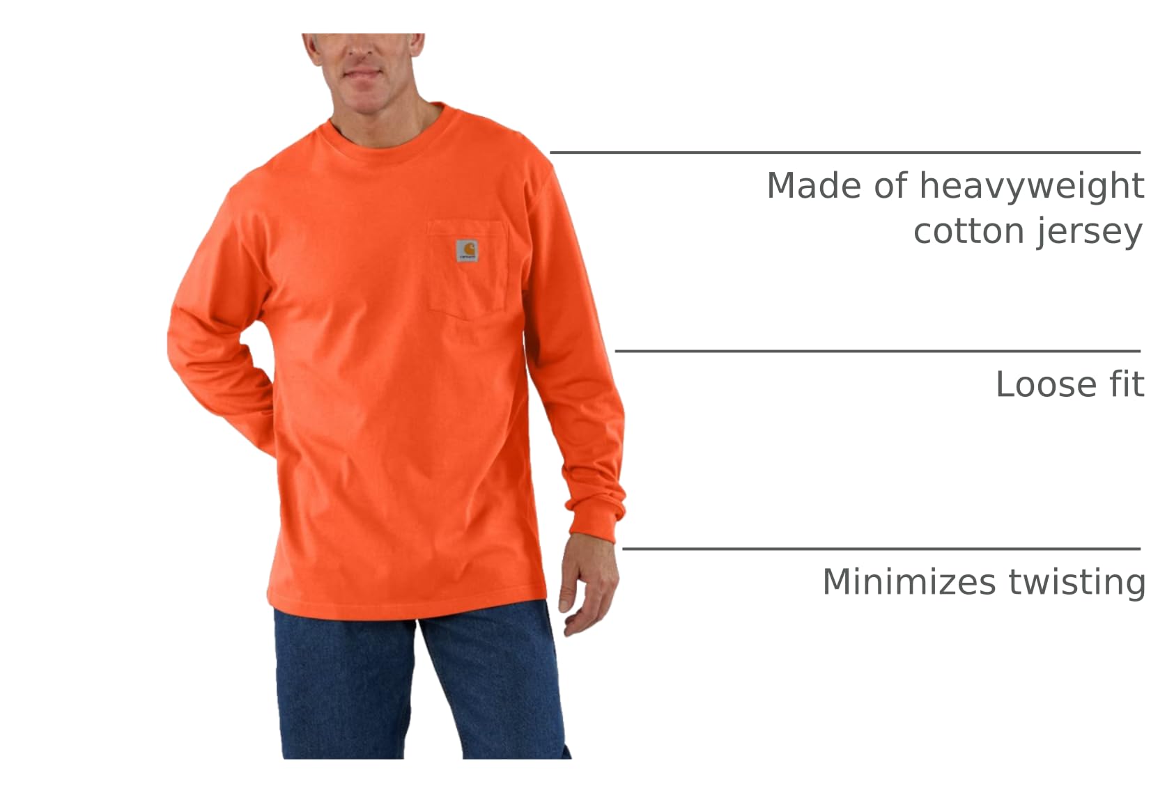 Description Product Description Heavyweight, durable and casual. Holds up when you put it through the ringer day after day. From the Manufacturer Made of 6.75-ounce, 100% cotton jersey our long sleeve pocket t-shirt makes for perfect workwear layered or worn alone. It features a crew neck with a generous left chest pocket and side-seamed construction to minimize twisting. Ash fiber content is 99%/1% polyester. Heather gray fiber content is 90% cotton/10% polyester.