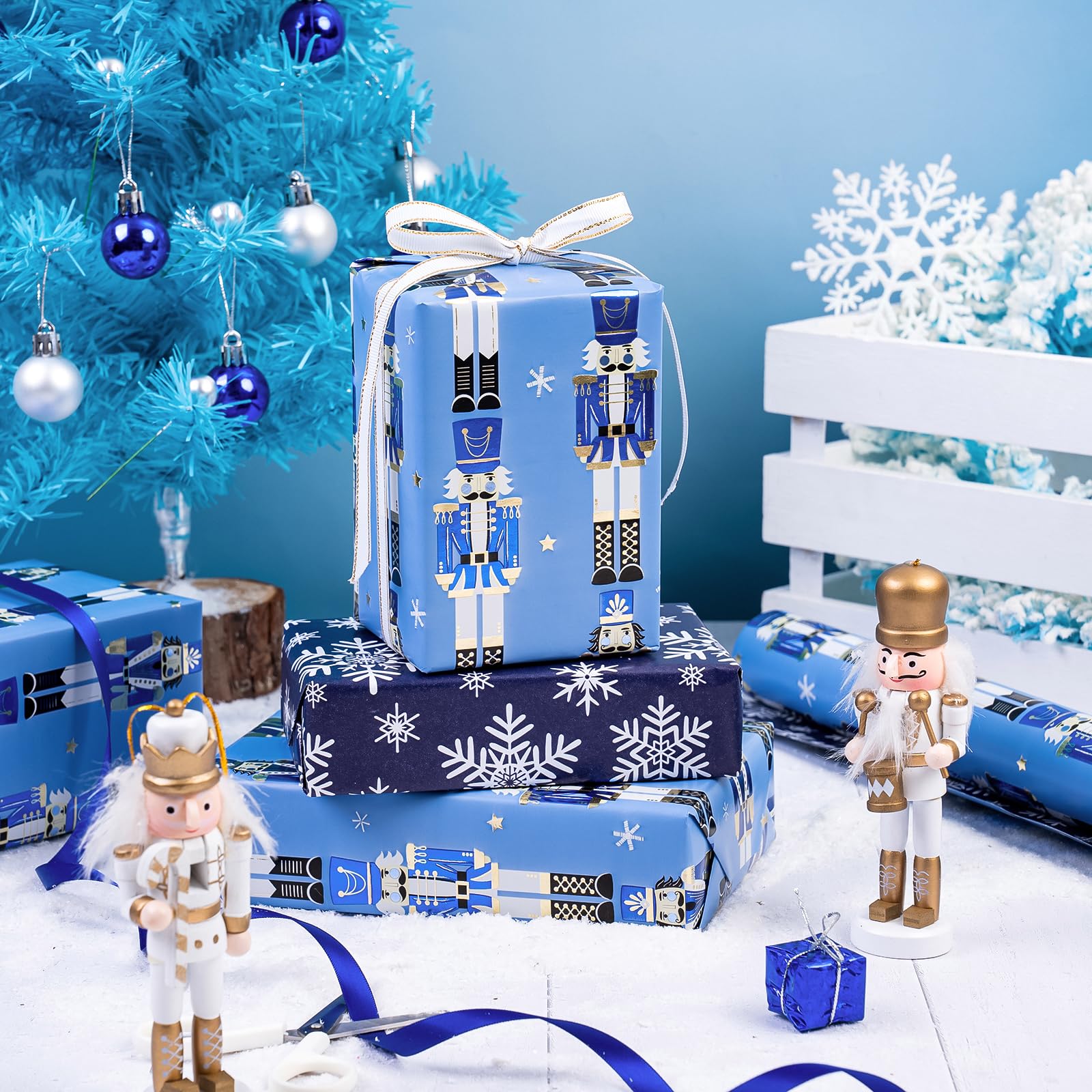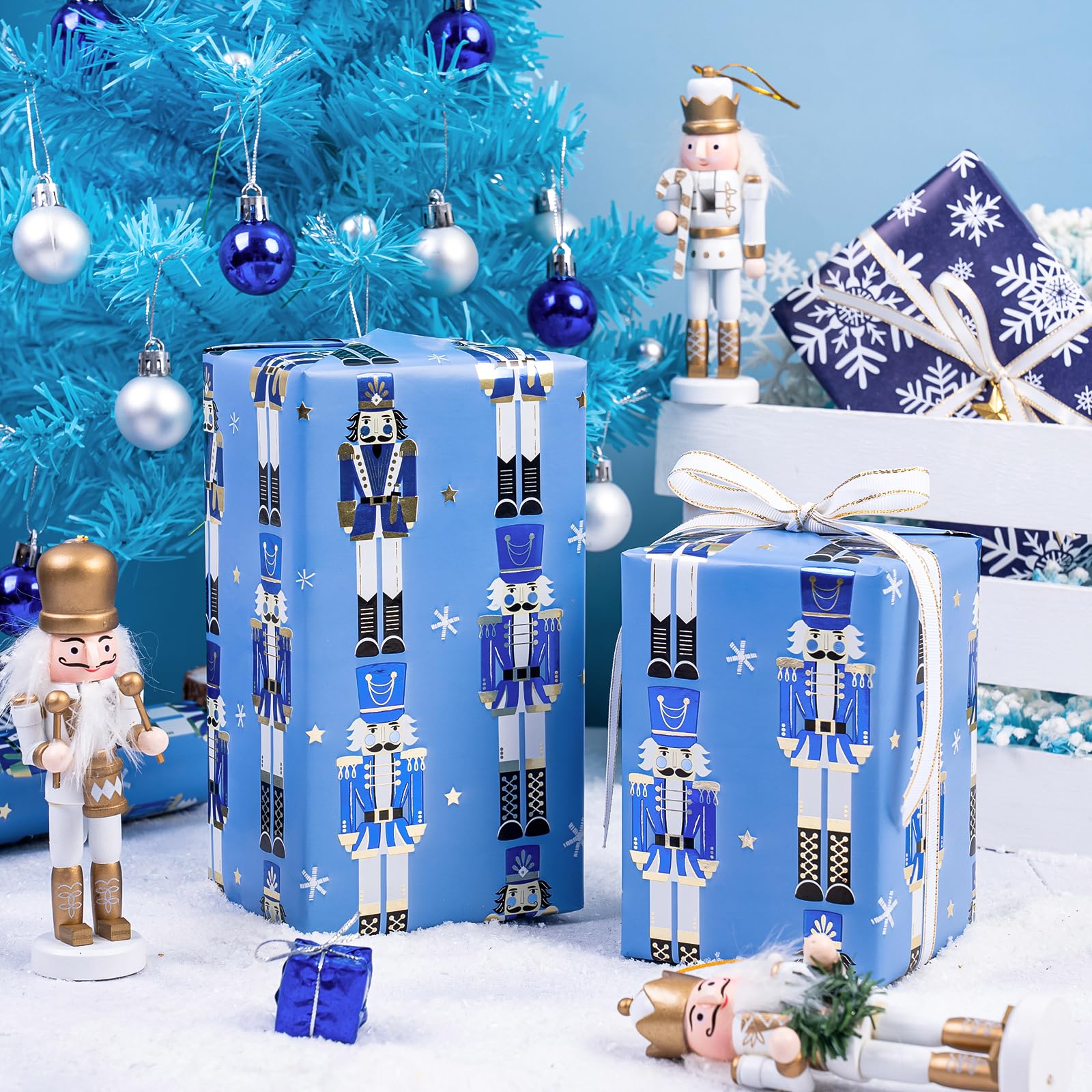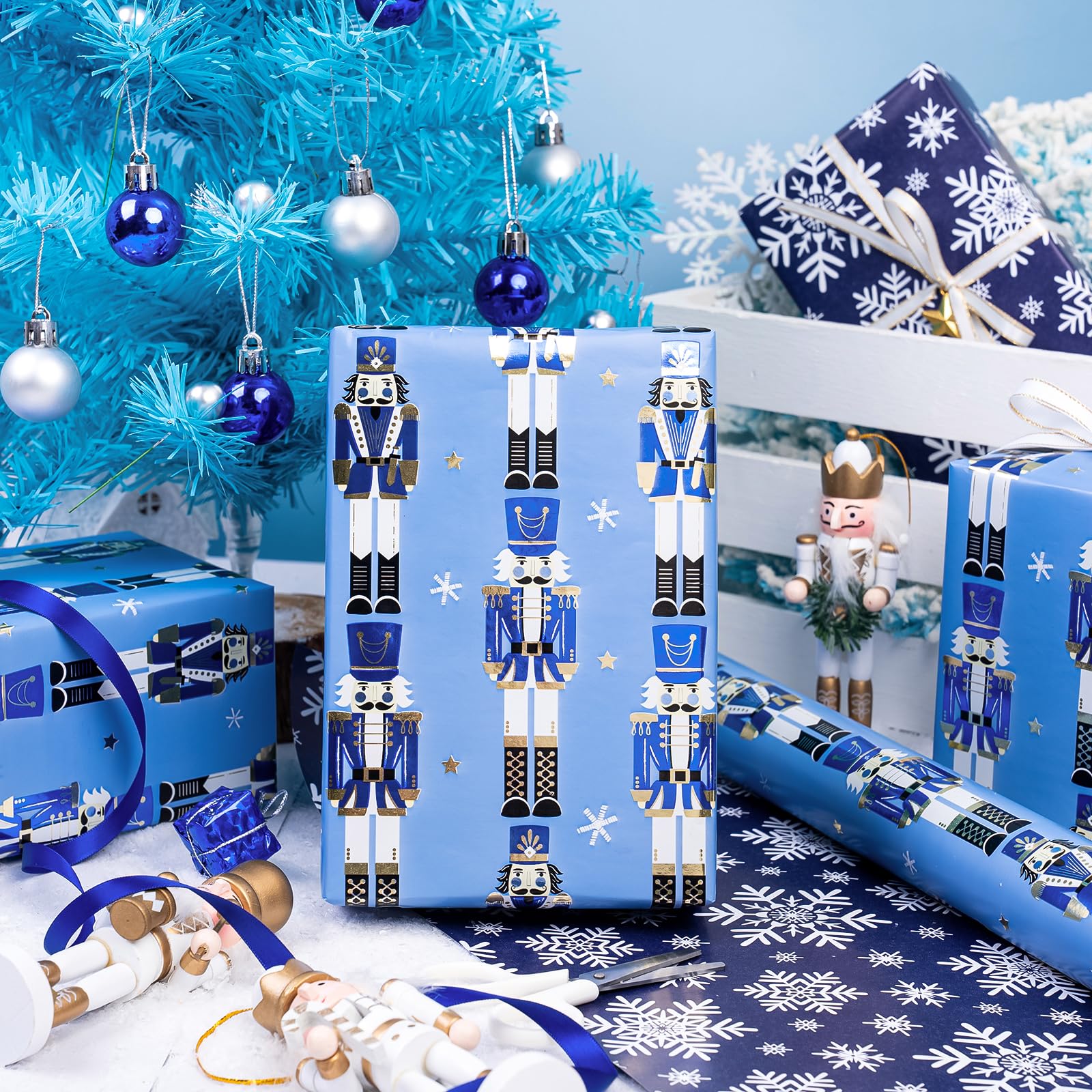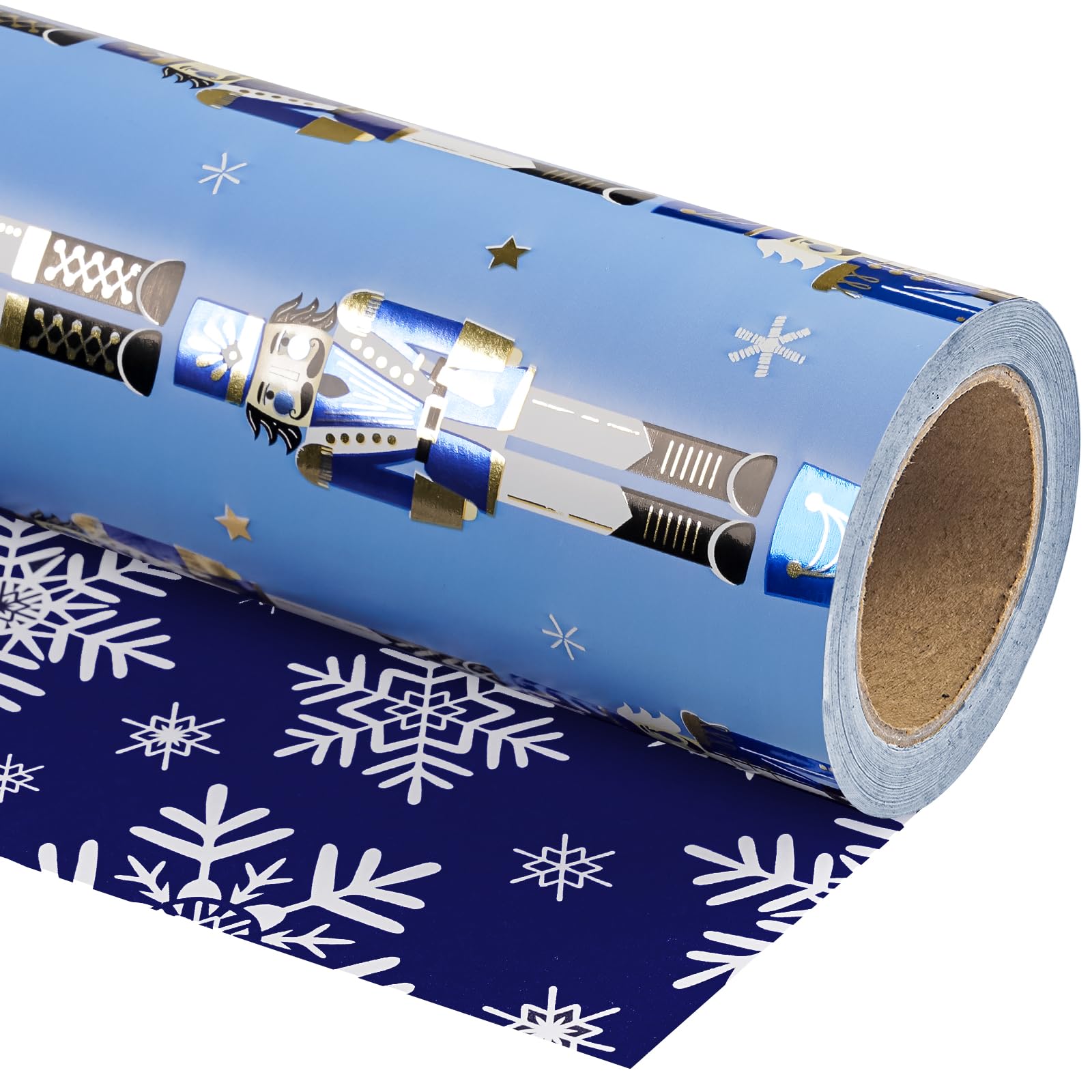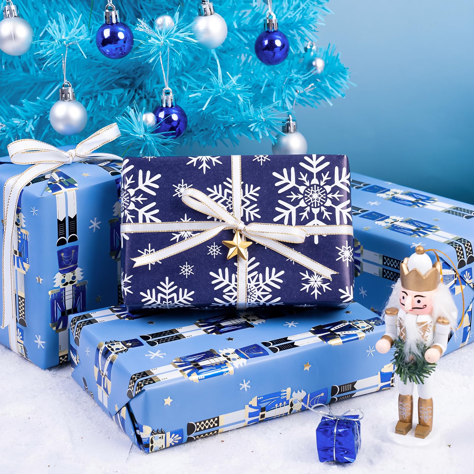 Perfect Size: Each roll measures 17 inch wide x 33 feet long. Providing you with a total of 46.5 square feet of paper, perfect for any Small or Medium sized gift. Reversible: Blue Christmas nutcracker with snowflakes and stars printed on one side, blue and white snowflakes printed on the reverse. Two different designs make unique and varied gift presentations easy. Premium Quality: Created with high-quality paper materials, thick and not easily tear or rip. Item came with shrink film to prevent wrapping paper from scratches and reduce dust. Use All Winter: Whether it's the joyous celebration of Christmas or the holiday season filled with family gatherings and gift - giving traditions, it is an outstanding choice. It is also great for decorating the Christmas tree. Wrap Your Love for Christmas: You can wrap your love with our special Christmas wrapping paper, adding a splash of color to all of your gifts. Your family, children, and friends will feel your sincere Christmas wishes this holiday season. Quality Customer Service: Any question about products or orders, please feel free to contact the customer service, we will try our best to solve the problem.