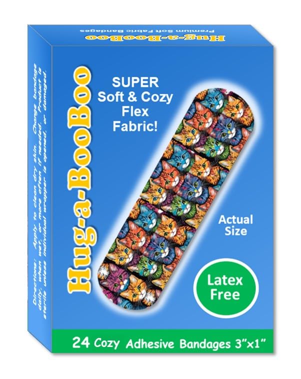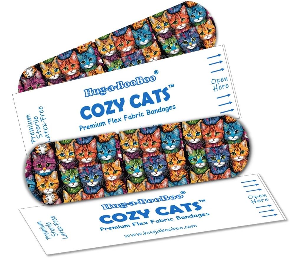 Wrap your wounds in cozy fun delight! These Soft and Comfy Flexible Fabric Bandages from Hug-a-BooBoo are Super Cozy! Latex Free Super Fun and Colorful Cat Bandages