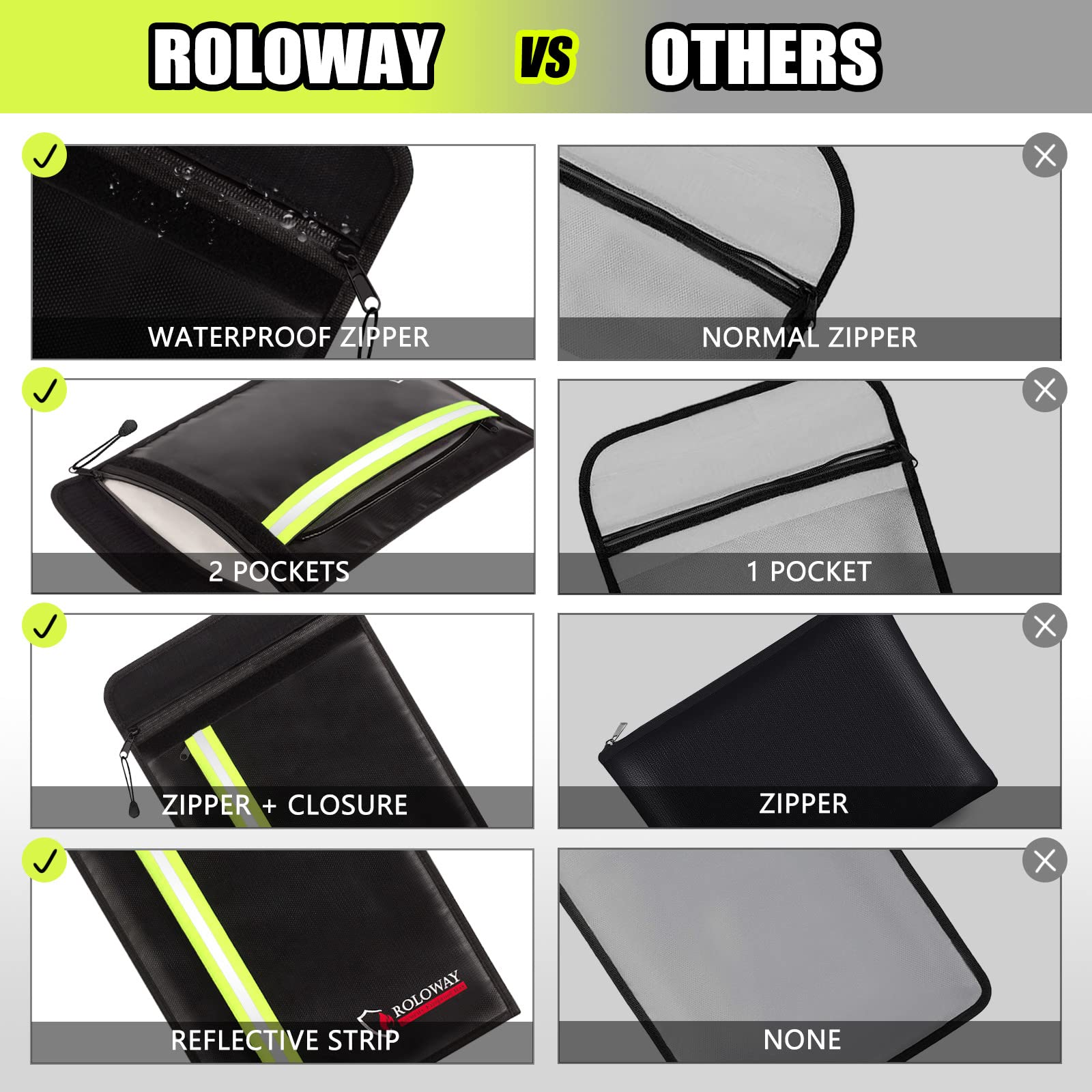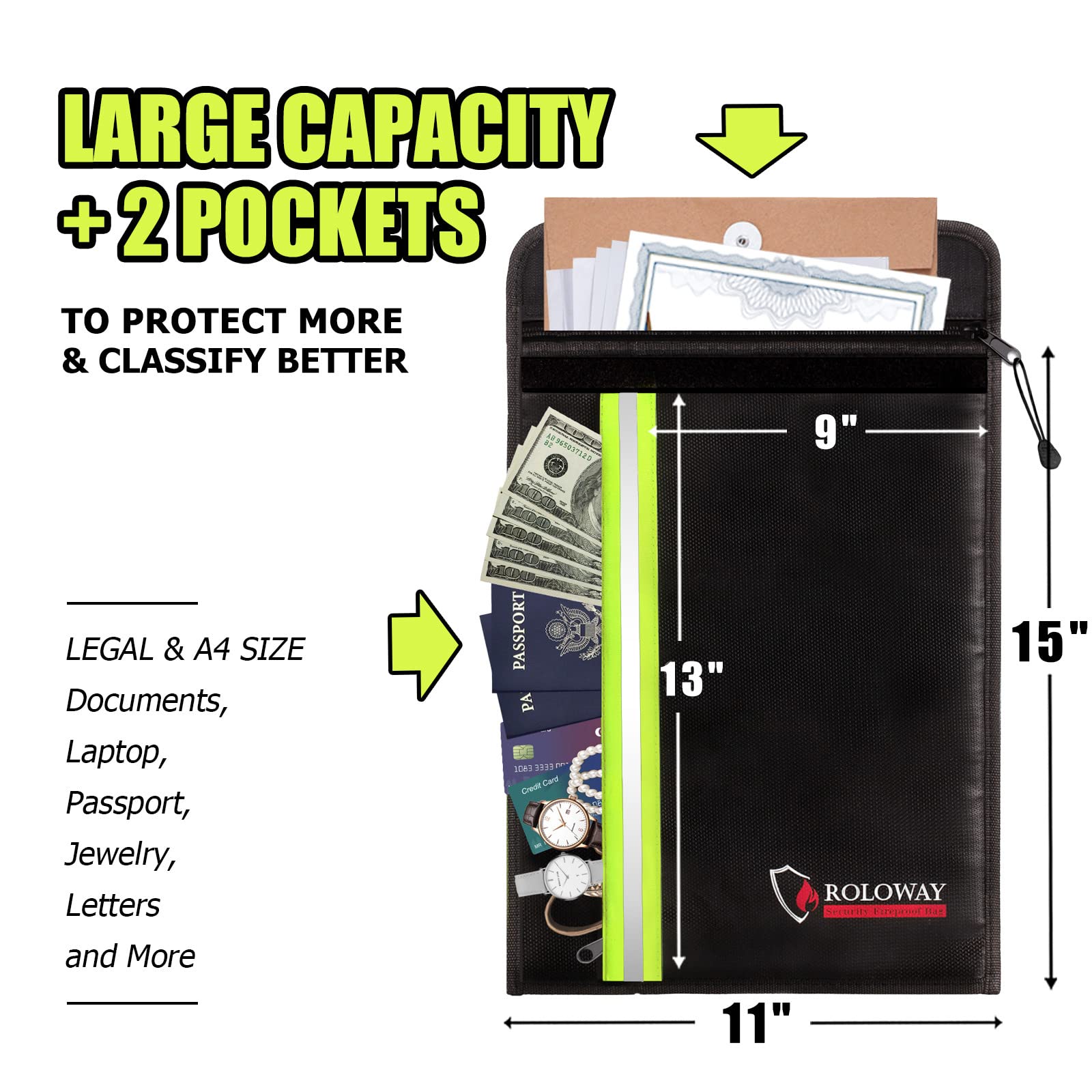 [UPGRADED - 2 POCKETS STORAGE DESIGN - MORE CAPACITY & EASY SORTING]: Compared with other fire proof bags with only 1 pocket, our 2-Pocket Storage Design is great to CLASSIFY & STOW MORE valuables. For the Big Pocket (15 x 11 inch), it's great to fit LEGAL SIZE & A4 SIZE documents, laptop, birth certificates, licenses, etc. Meanwhile, the Front Pocket (13 x 9 inch) of our fireproof pouch is great to store your small items, like passport, jewelry, letters, photos, money storage, etc.