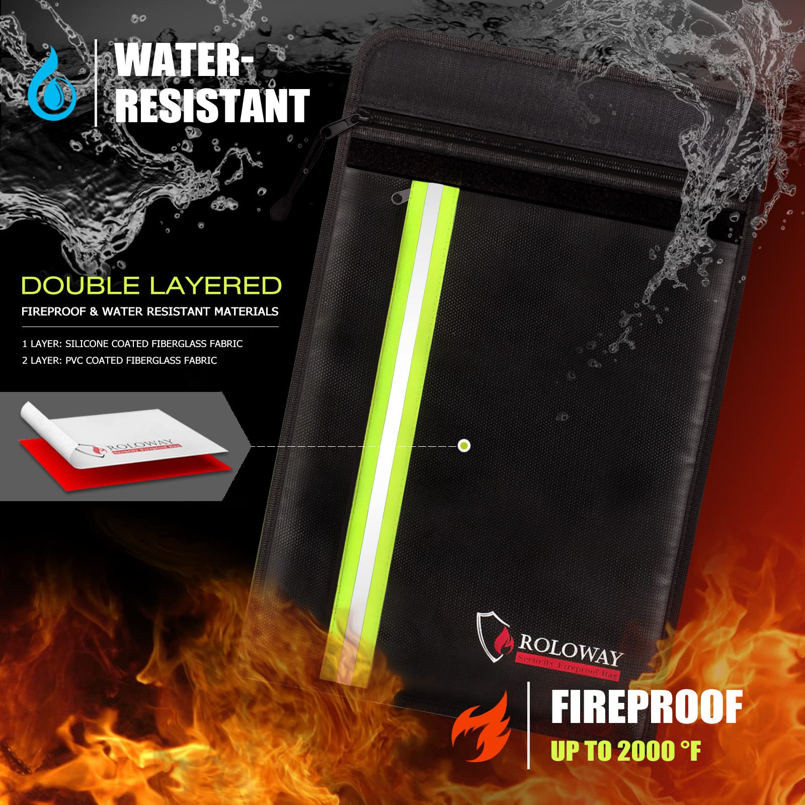 [WATER RESISTANT & FIREPROOF BAG - PROTECTION IN All CONDITIONS]: With Dual-layer FIBERGLASS, our large Fireproof Document Bag can withstand temperature as high as 2000 F in certain time (UL94 VTM-0). Meantime, the SILICONE COATED LAYER brings great water protection to the fireproof document safe. Our fireproof money bag for cash performs reliable in ALL weather conditions. Suitable for indoors, outdoors, and EMERGENCY PREPARATION, such as rain storm, hurricane & earthquake
