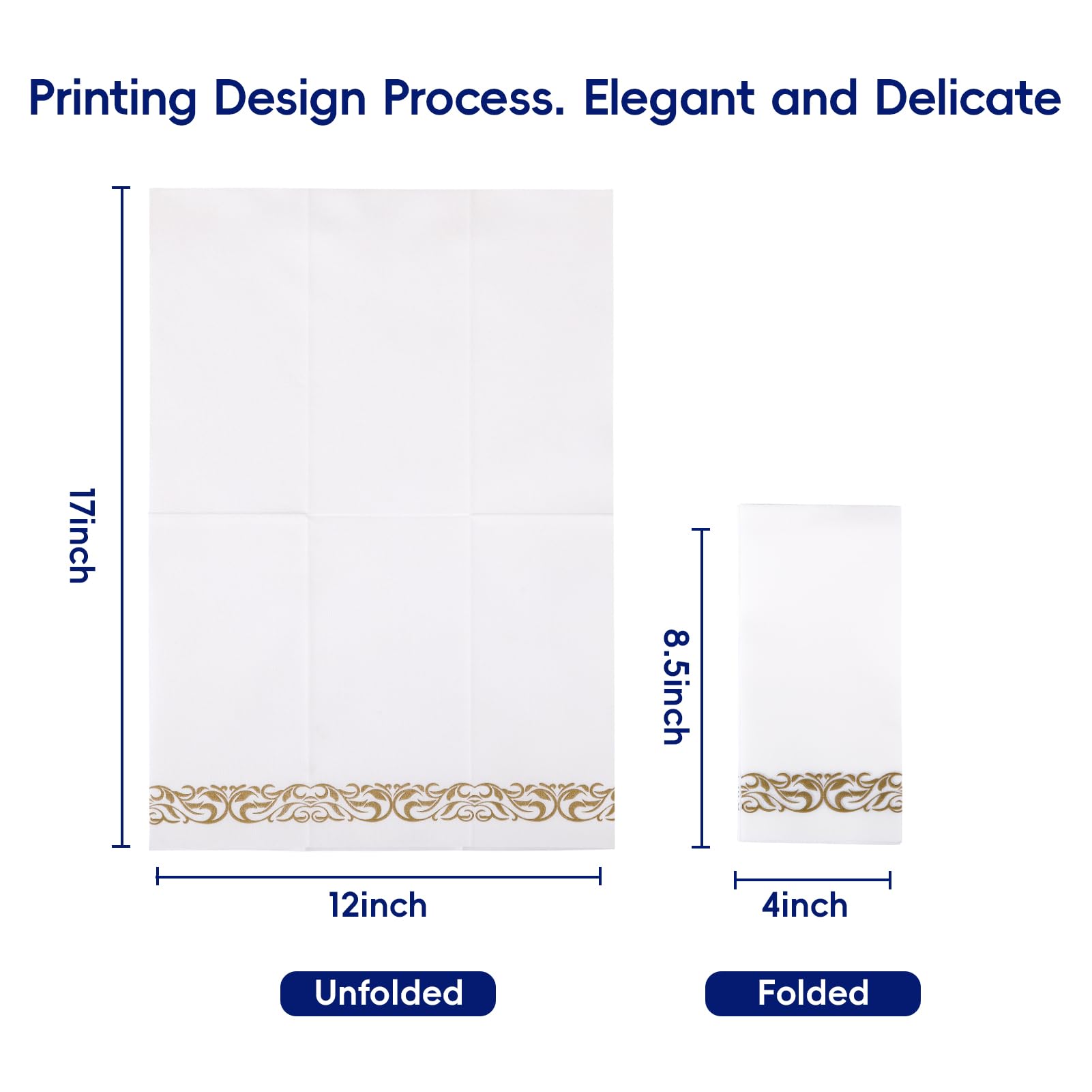 Elegant Decorative Napkins: The disposable hand towel is printed with a delicate gold pattern, which shows your fashion sense. After the unfolding, a side of the print is displayed in front of the eyes, which is more delicate than the ordinary one. Add charm and elegance to your dining table, bedroom, and bathroom.