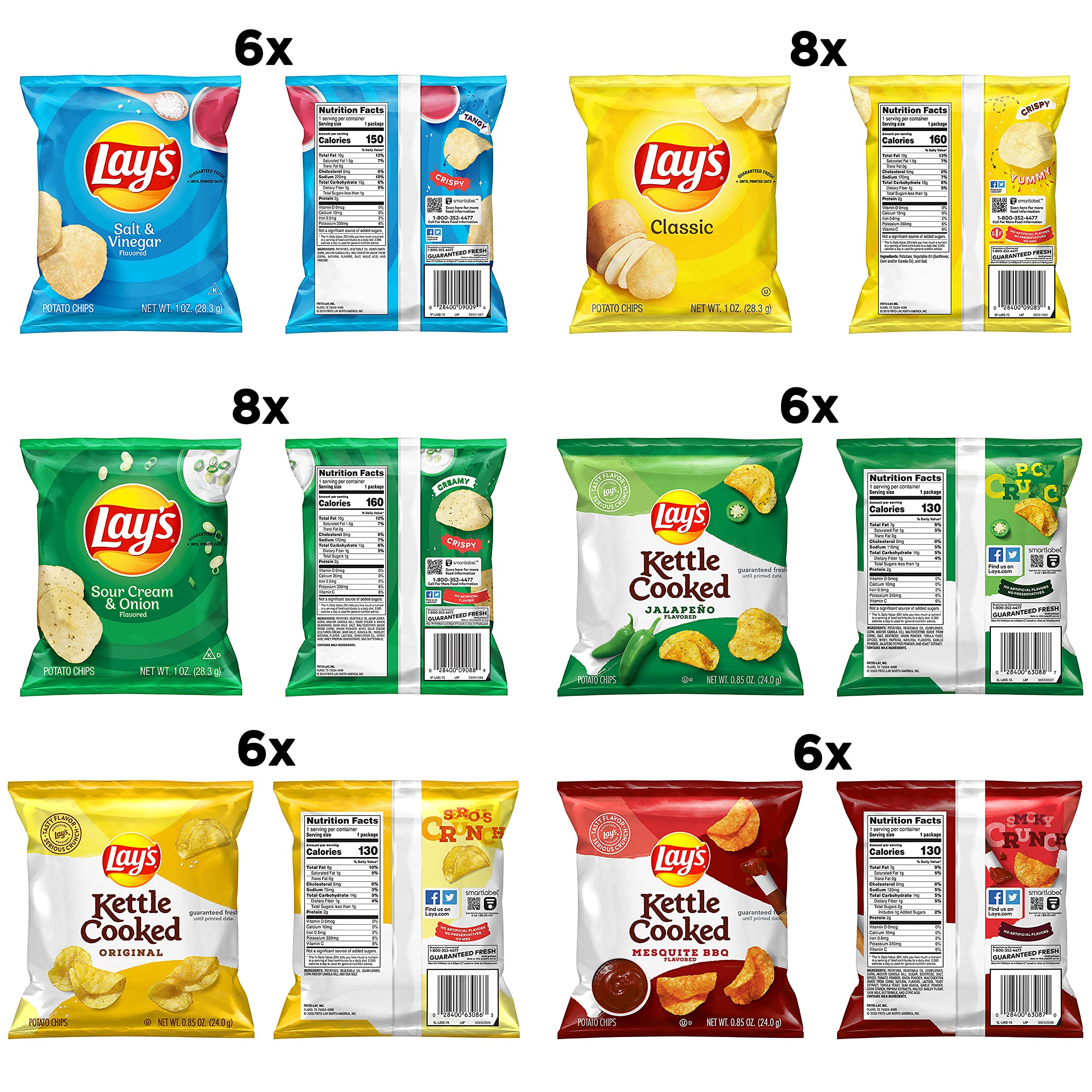 Includes (6) Kettle Cooked Jalapeno, (6) Kettle Cooked Original, (6) Kettle Cooked Mesquite BBQ, (6) Salt & Vinegar, (8) Classic, and (8) Sour Cream & Onion