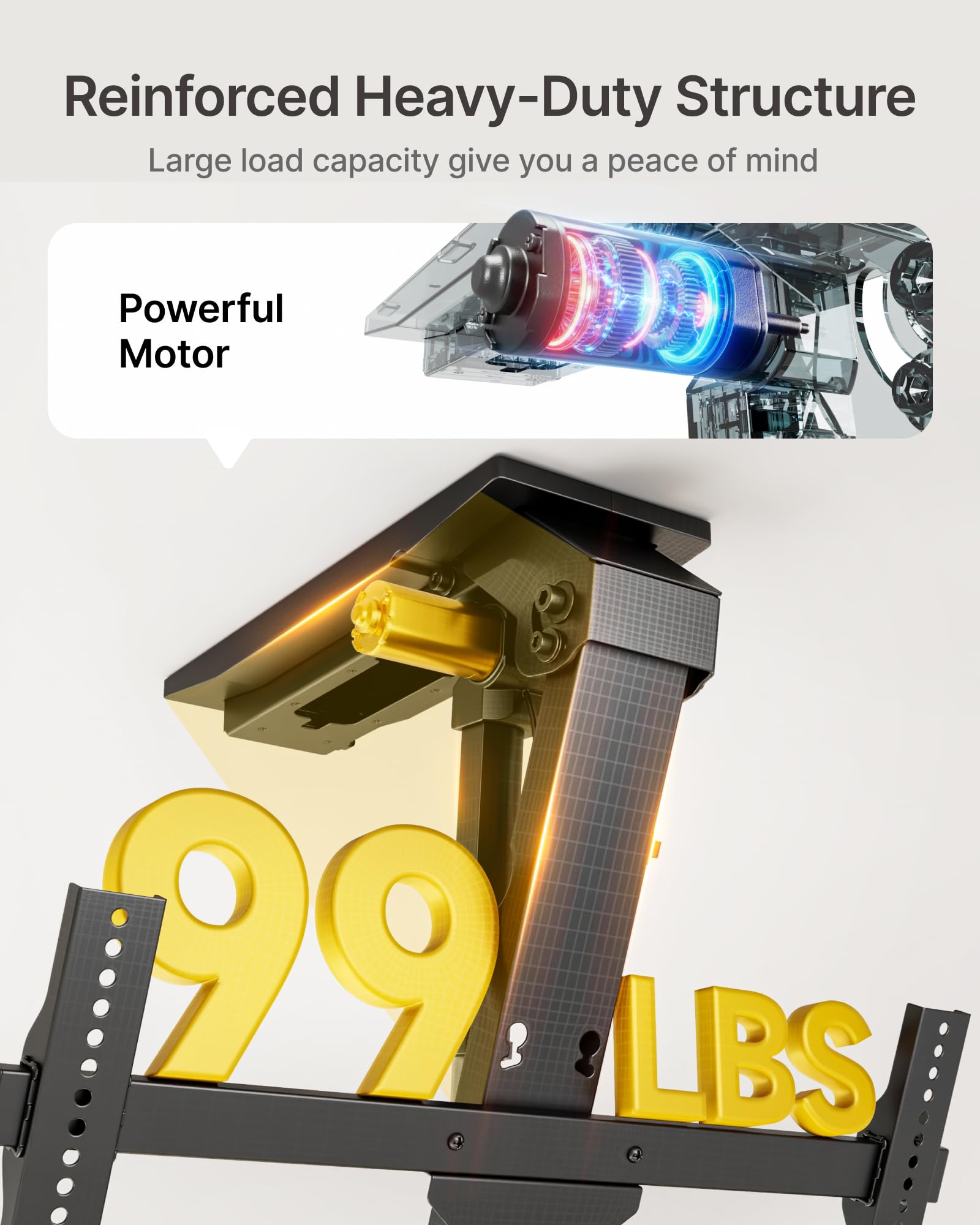 99LBS High Strength(4X Weight Tested!!!) & 20,000 Extension Cycles Tested!!! - Engineered for safety and strength, this sturdy motorized tv mount built with a powerful, upgraded motor for reliable performance and securely holds TVs weighing up to 99 lbs. monTEK motorized tv mount with remote installs seamlessly on flat or sloped concrete, brick, and wood ceilings. Note: Not for wood studs.
