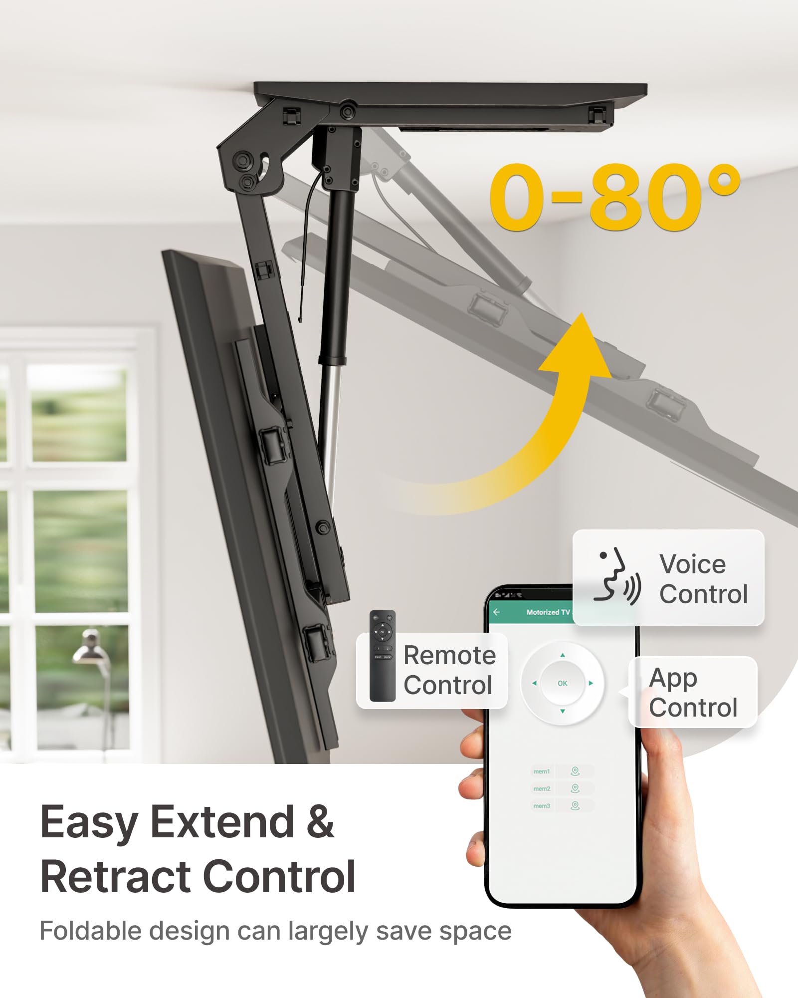 Reclaim Your Floor & Wall Space - This innovative motorized tv mount lifts your TV up and out of the way, folding flat against the ceiling when not in use. This liberates up your valuable floor and wall space for other furniture and decorations, ideal for creating a clean, minimalist look.