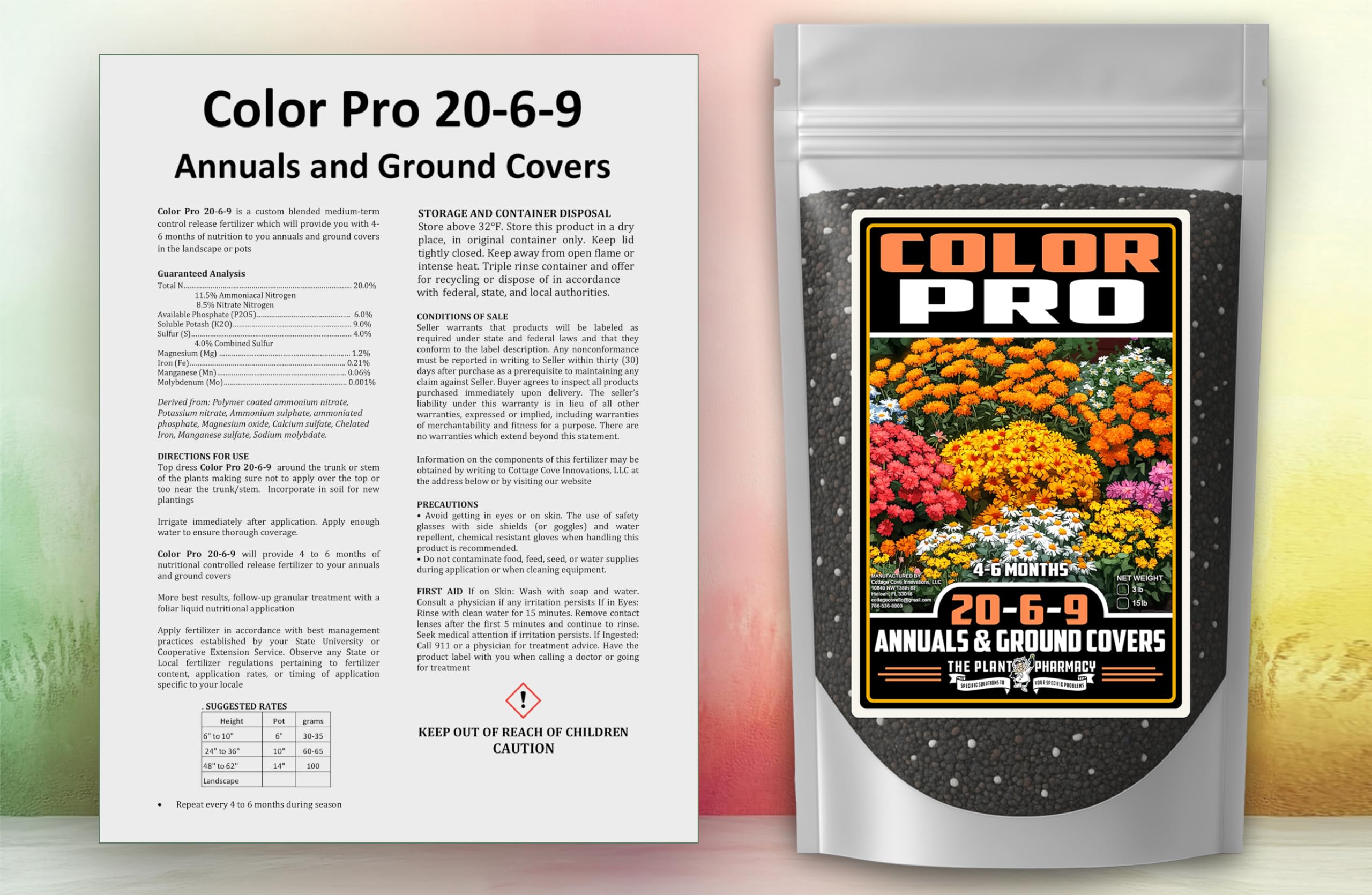 Color Pro 20-6-9 is a specially formulated controlled-release fertilizer designed to provide 4-6 months of continuous nutrition for your annuals and ground covers, both in landscapes and pots. With a balanced NPK ratio of 20-6-9, it delivers essential nutrients like nitrogen, phosphate, and potash to promote healthy plant growth and vibrant blooms. This custom blend also includes vital micronutrients such as sulfur, magnesium, iron, manganese, and molybdenum, ensuring your plants receive a comprehensive nutrient package for optimum performance throughout the growing season. Perfect for gardeners looking for an easy-to-use, long-lasting solution, Color Pro 20-6-9 supports robust plant health and growth. To apply, simply top-dress around the plant's trunk or stem, ensuring the fertilizer does not touch the plant directly. For new plantings, incorporate it into the soil. Color Pro 20-6-9 works best when followed up with a foliar liquid nutritional application. Ideal for both amateur and professional gardeners, this slow-release fertilizer is a versatile addition to your gardening routine.